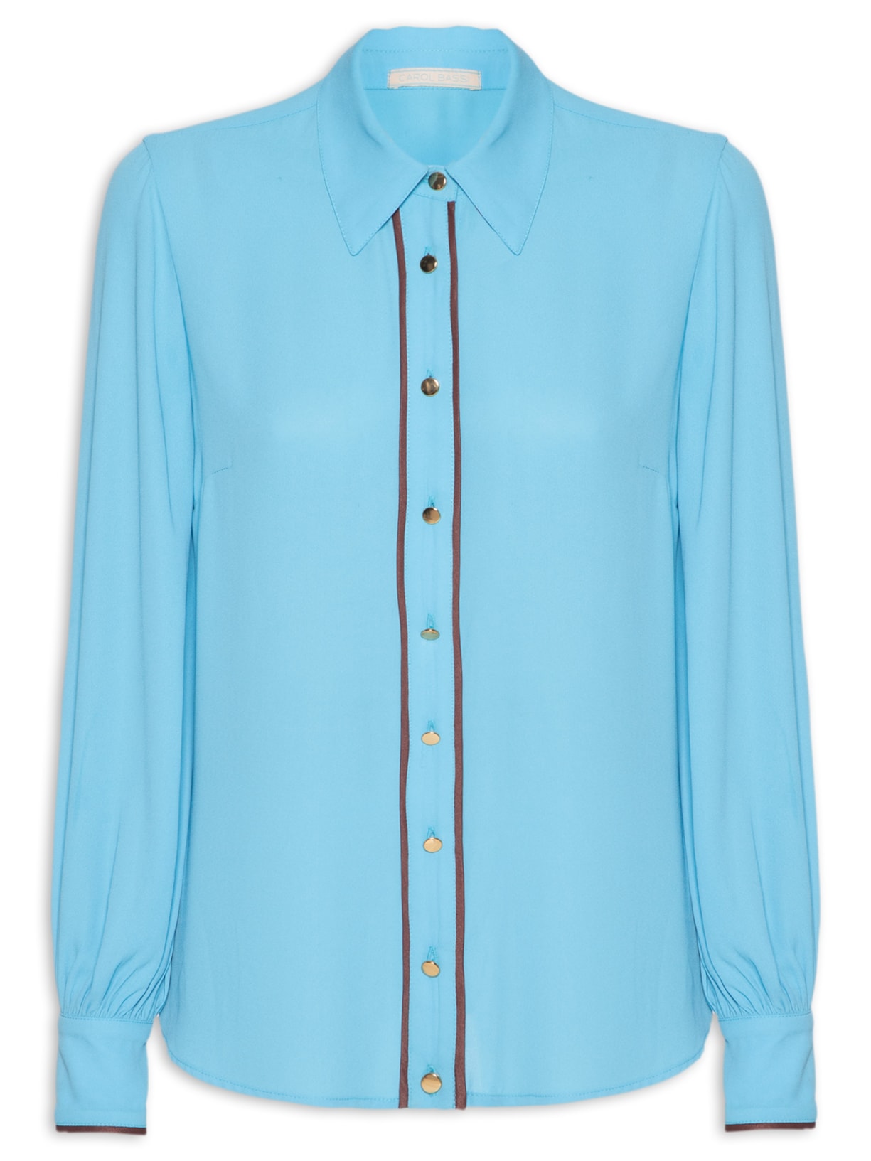 A camisa azul é confeccionada em tecido leve sem elasticidade. A peça solta ao corpo possui colarinho clássico, mangas longas com efeito franzido e abotoamento, pences nas laterais do busto, frisos na cor marrom na parte frontal e fechamento frontal por botões metalizados.