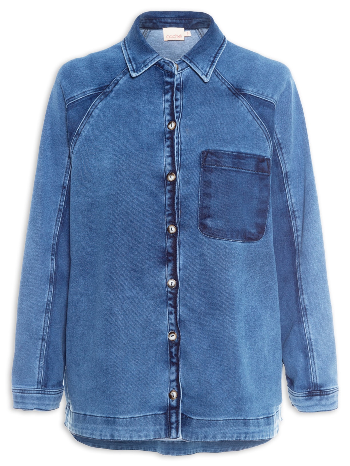 A camisa azul é confeccionada em sarja com lavagem em jeans. A peça possui colarinho simples, mangas longas modelo raglan com abotoamento nos punhos, ombros estendidos, recortes nas mangas, bolso frontal, recortes e bolso em diferente lavagem, shape solto, caimento reto, acabamento pespontado, comprimento alongado e fechamento frontal por botões.