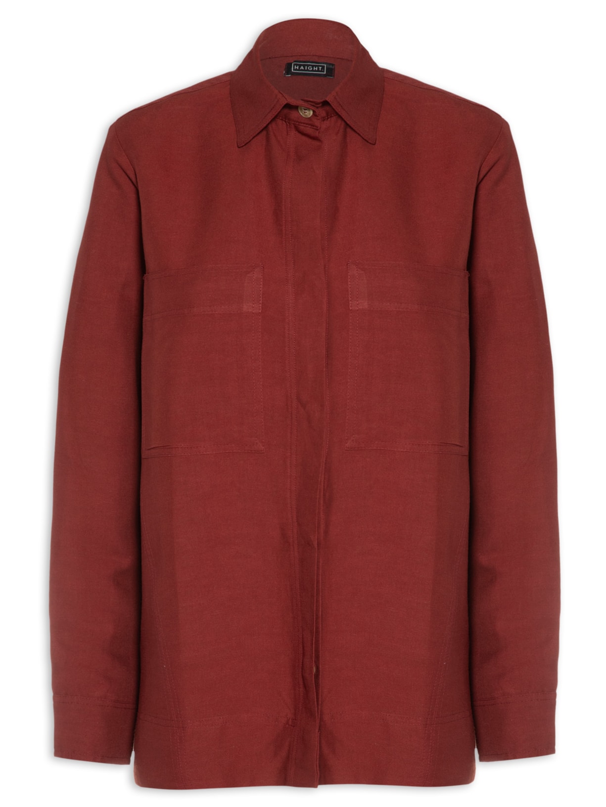 A camisa vinho é confeccionada em tecido leve com toque de linho. A peça possui colarinho simples, mangas longas com abotoamento e detalhe de prega nos punhos, bolsos frontais, recortes posteriores e frontais, comprimento alongado, shape solto, caimento reto, acabamento pespontado e fechamento frontal por botões com vista sobreposta.