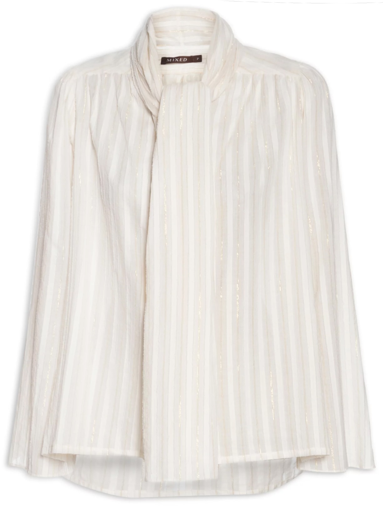 A camisa off white é confeccionada em tecido leve sem elasticidade. A peça solta ao corpo, possui decote em V, faixas largas sobrepostas no decote para amarração, mangas longas com leve franzido nos ombros, recortes franzidos na altura dos ombros, fendas laterais, padronagem listrada com fios de lurex, leve transparência, barra mullet* e fechamento frontal por botões.