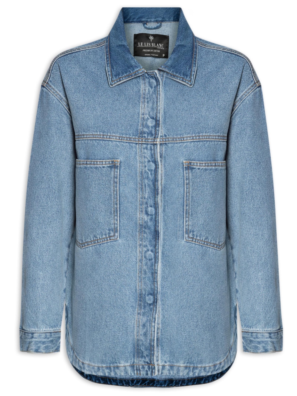 O camisa azul é confeccionada em sarja com lavagem em jeans sem elasticidade. A peça solta ao corpo possui colarinho clássico, mangas longas com abotoamento nos punhos, ombros estendidos, recorte posterior e frontal, tira fina aplicada na parte posterior, efeito estonado, barra arredondada, comprimento alongado e fechamento frontal por botões.