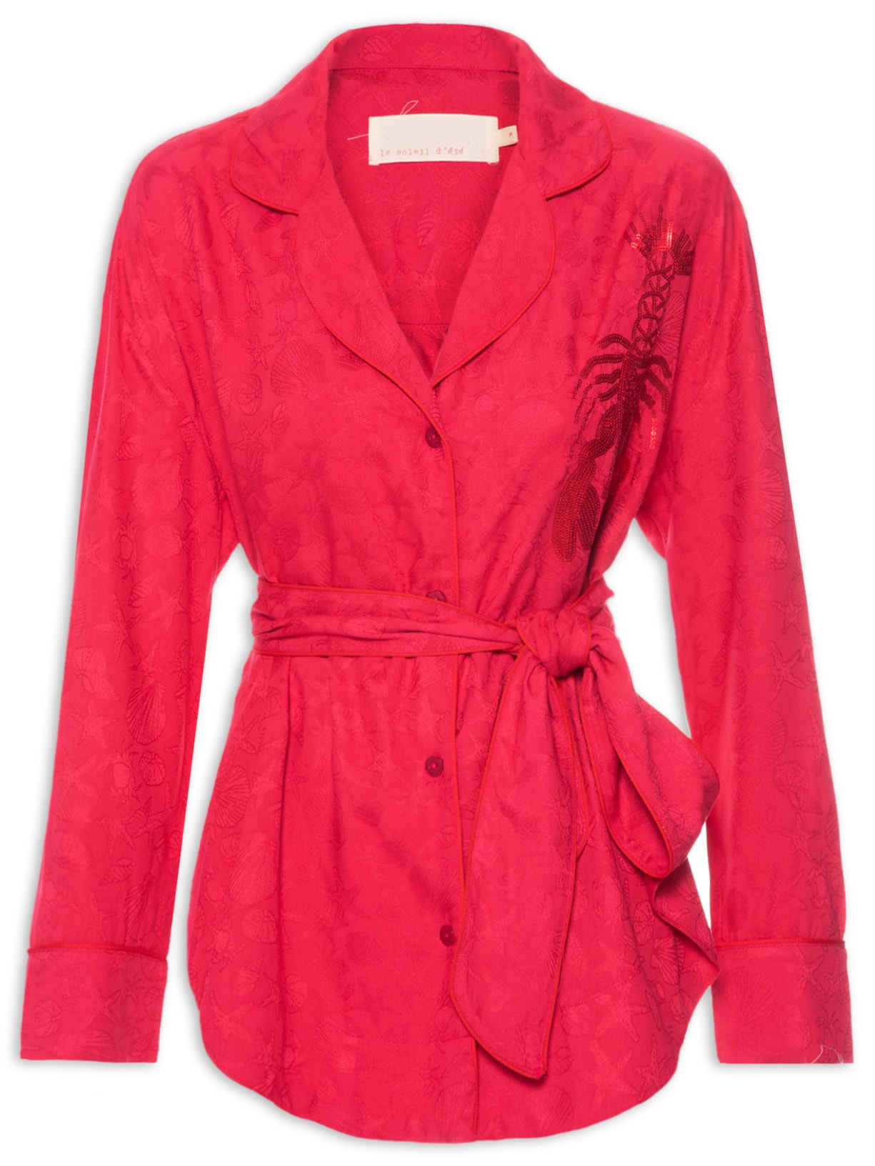 A camisa vermelha é confeccionada tecido leve sem elasticidade. A peça solta ao corpo possui lapela chanfrada com bordas arredondadas, ombros estendidos, mangas longas com recorte e detalhe de vivo na altura dos punhos, bordado figurativo de lagosta em paetê na parte frontal, recorte posterior com detalhe de pregas, laterais com passantes aplicados, padronagem figurativas em tom contrastante, barra mullet* arredondada e fechamento frontal por botões.