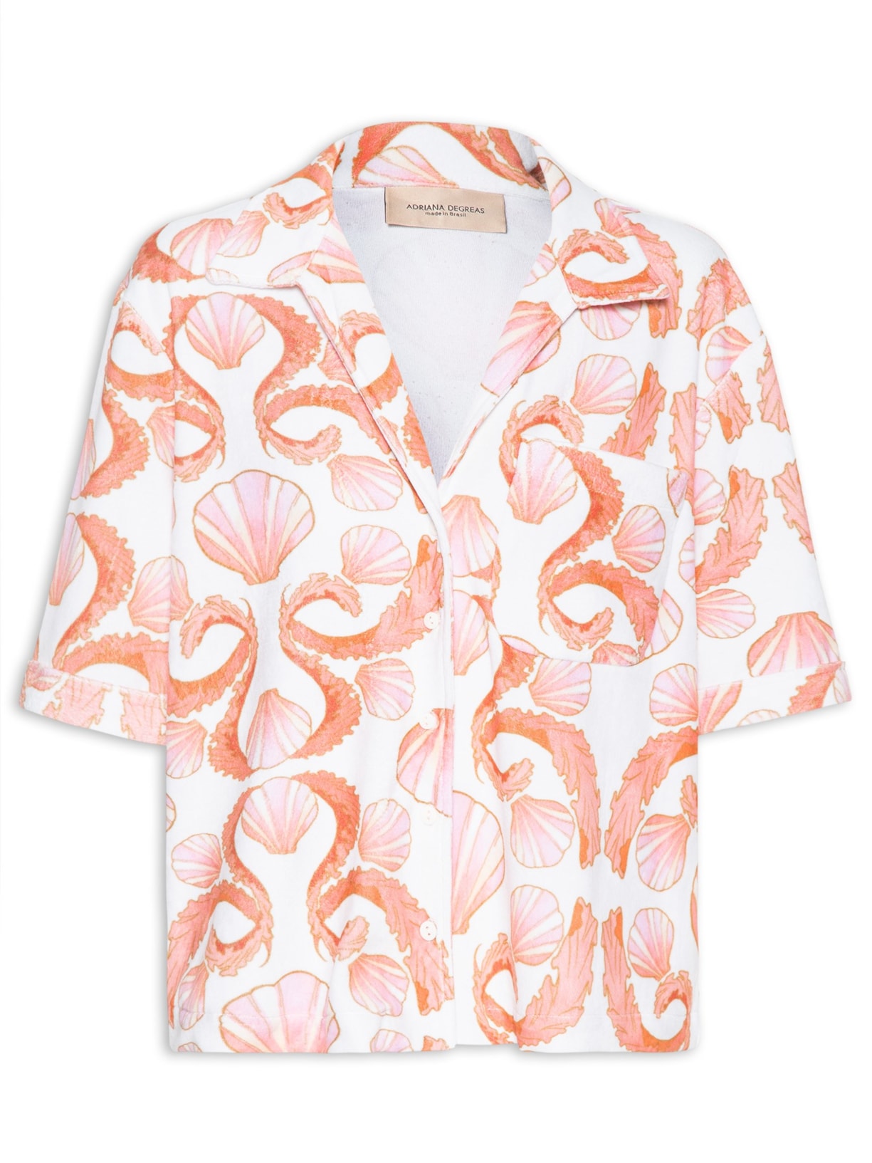 A camisa off white é confeccionada em tecido leve com superfície atoalhada. A peça solta ao corpo possui colarinho clássico, ombros estendidos, mangas curtas com barra italiana, bolso frontal, estampa figurativa de conchas em tons contrastantes e fechamento frontal em botões.