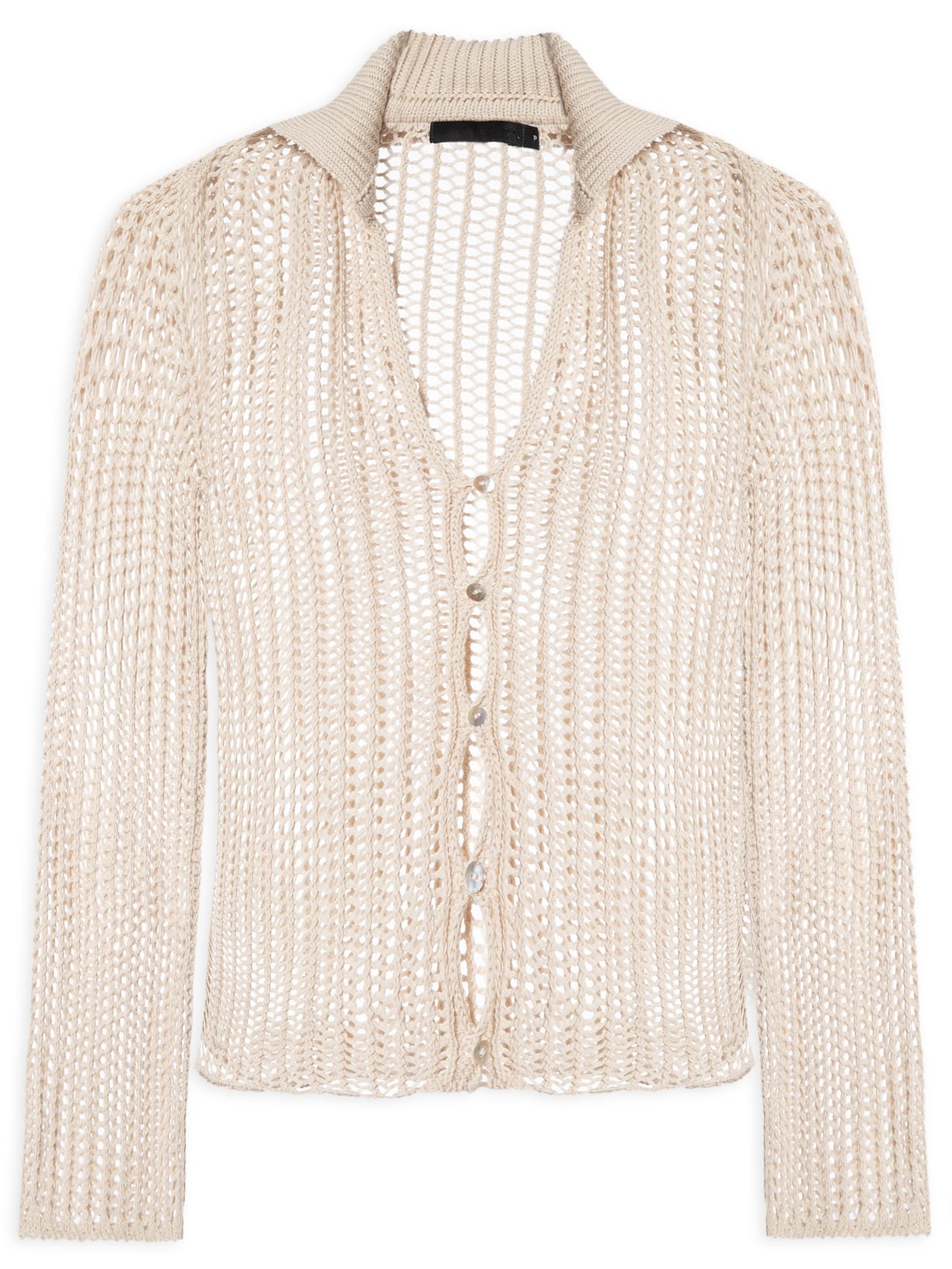 A camisa bege é confeccionada em tricot de alta elasticidade. A peça solta ao corpo possui colarinho simples, ombros estendidos, mangas longas, trama com recortes vazados, sem forro e fechamento frontal em botões.