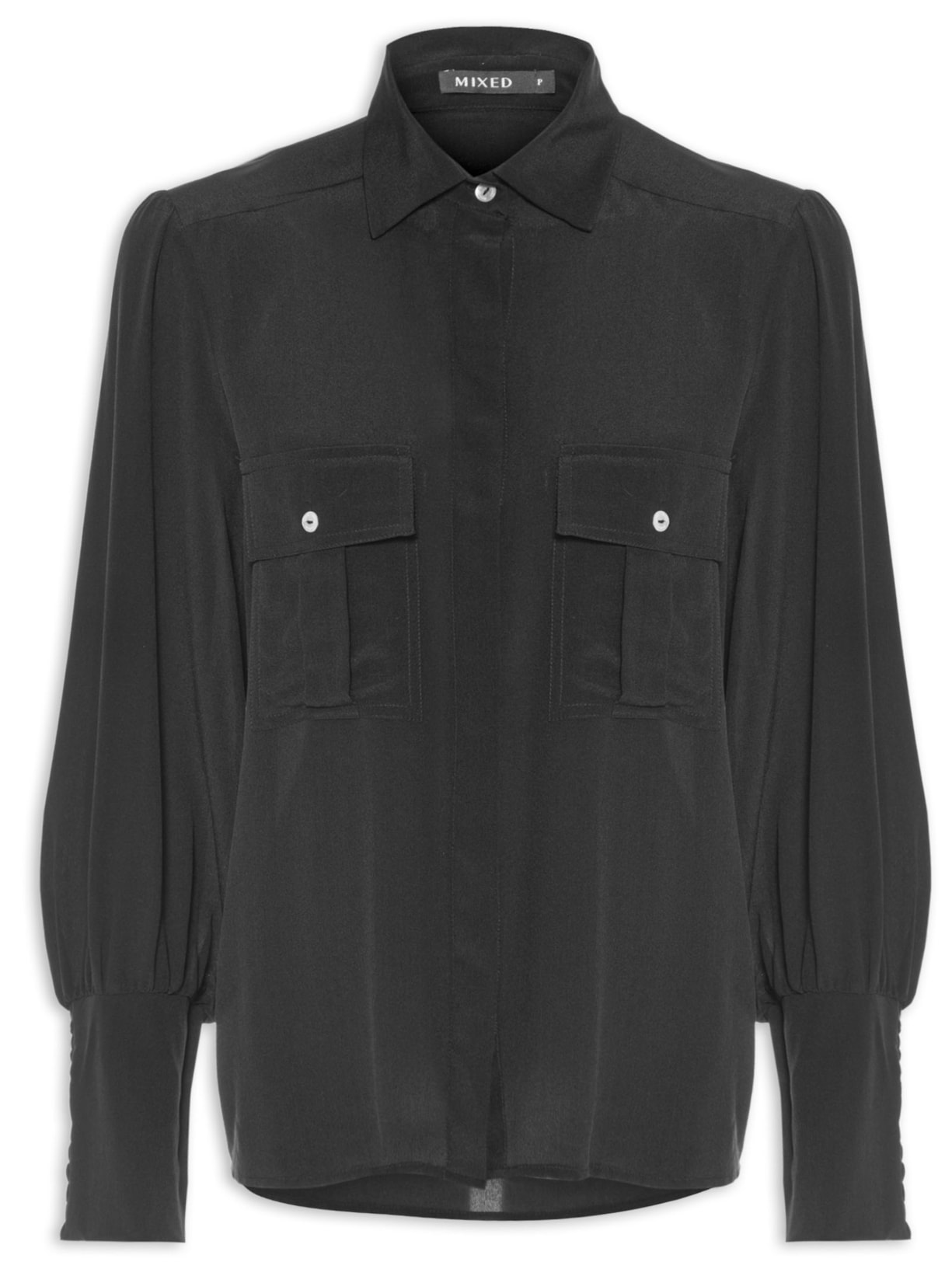 A camisa preta é confeccionada em seda. A peça possui colarinho simples, mangas longas com recorte em lastex nos punhos, recorte posterior, detalhe de franzido na parte posterior e na altura dos ombros, bolsos frontais com prega e fechamento por aba e botão, shape solto e fechamento frontal por botões com vista sobreposta.