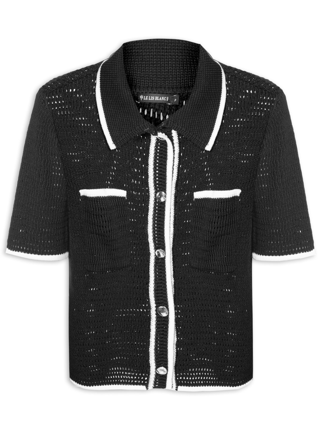 A camisa preta é confeccionada em tricot com média elasticidade. A peça solta ao corpo possui colarinho simples com tag metalizada da marca aplicada na parte posterior, mangas curtas, bolsos frontais aplicados na altura do busto, acabamento em friso na cor branca e fechamento frontal por botões metalizados.