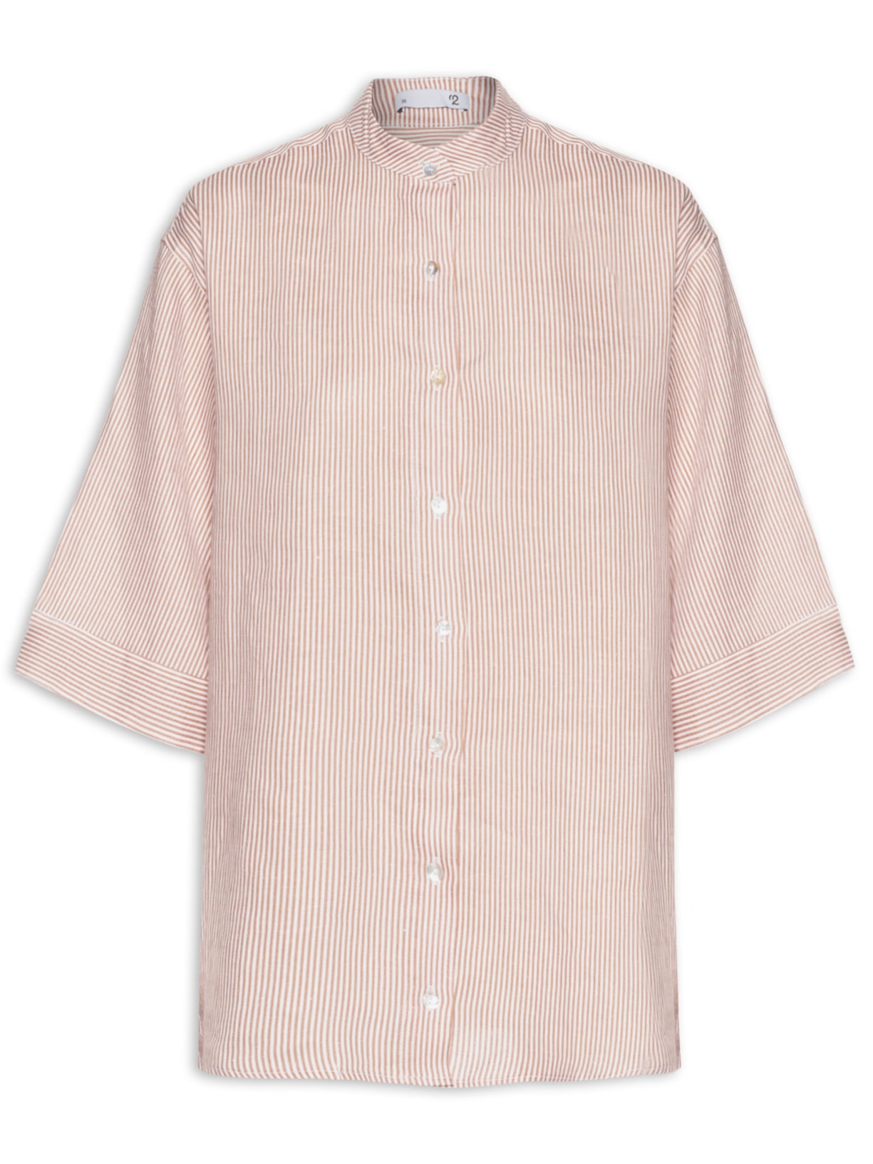 A camisa bege é confeccionada em linho sem elasticidade. A peça solta ao corpo modelo oversized* possui gola padre, ombros estendidos com mangas 3/4 amplas, recorte posterior, padronagem de listras na cor branca e fechamento frontal por botões.