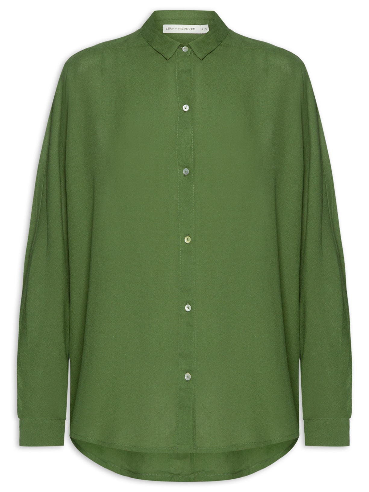A camisa verde é confeccionada por tecido leve com toque em linho sem elasticidade. A peça solta ao corpo possui colarinho simples, mangas longas com ajuste nos punhos por botão, ombros estendidos, recorte posterior, barra com acabamento arredado, barra mullet* e fechamento por botão frontal.
