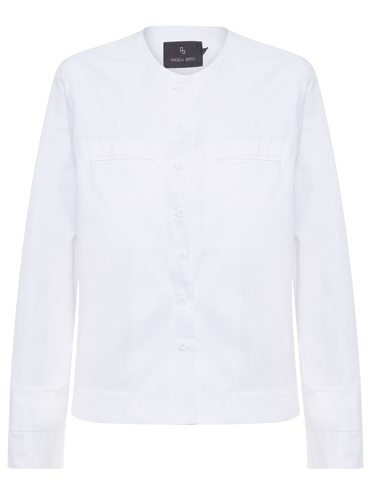 A camisa branca é confeccionada em tecido leve. A peça solta ao corpo possui decote redondo, mangas longas com recortes sobrepostos nos punhos, bolsos frontais embutidos na altura do busto e fechamento frontal por botões.