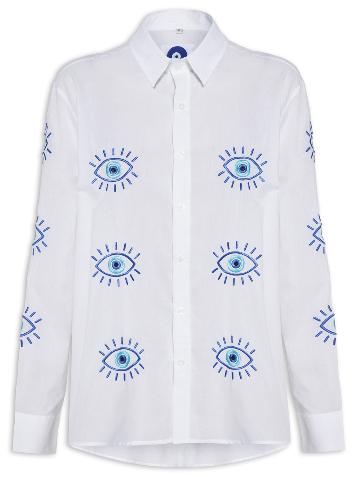 A camisa branca é confeccionada em tecido leve sem elasticidade. A peça solta ao corpo possui colarinho clássico, ombros estendidos, mangas longas com abotoamento nos punhos, fendas laterais, aplicação de bordados figurativos de olho grego em cores contrastantes, transparência, barra mullet* arredondada, comprimento alongado e fechamento frontal em botões.