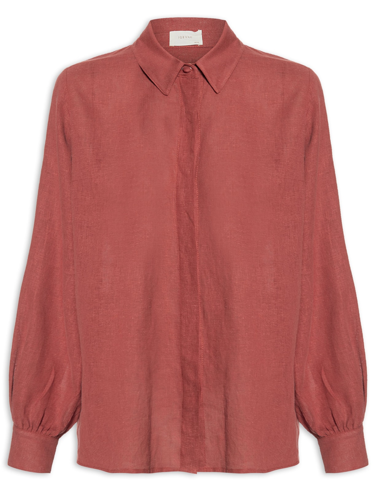 A camisa vinho é confeccionada em linho misto sem elasticidade. A peça solta ao corpo possui colarinho simples, mangas longas com abotoamento nos punhos, pences na altura do busto e fechamento frontal por botões com vista sobreposta.