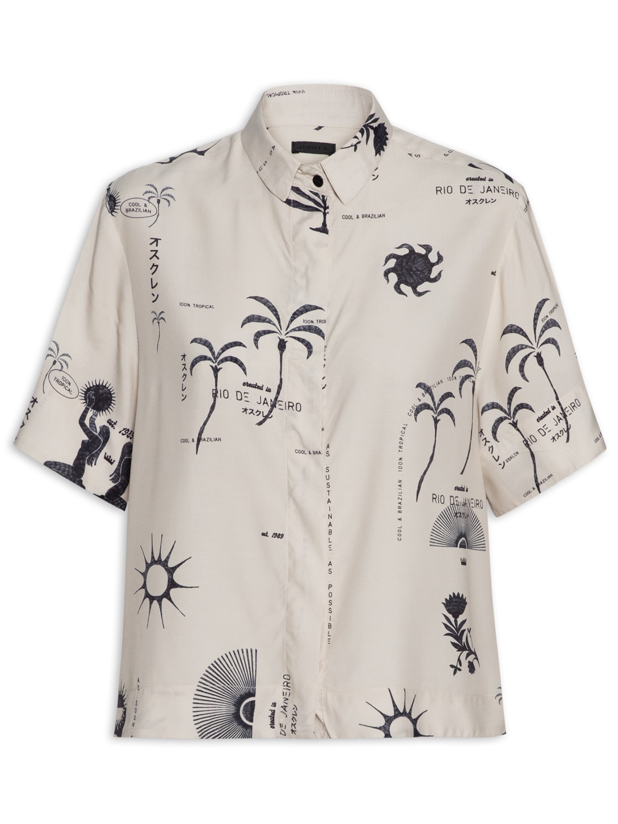 A camisa bege é confeccionada em tecido leve e sem elasticidade. A peça solta ao corpo possui colarinho clássico, mangas curtas, fendas laterais, recorte posterior, estampas figurativas em cor contrastante, leve transparência e fechamento frontal em botões.