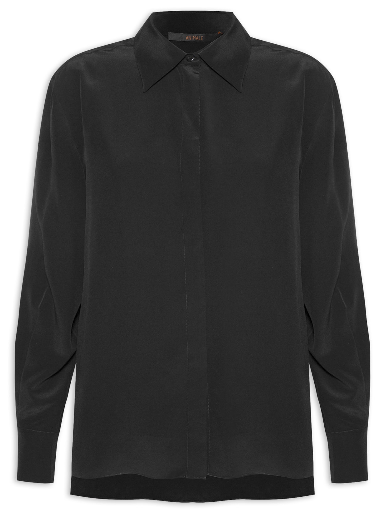 A camisa preta é confeccionada em seda. A peça possui colarinho clássico, mangas longas com detalhe de pregas e abotoamento nos punhos, recorte posterior com detalhe de pregas, barra mullet* arredondada, comprimento alongado, shape solto, caimento reto, acabamento pespontado e fechamento frontal por botões e vista sobreposta.