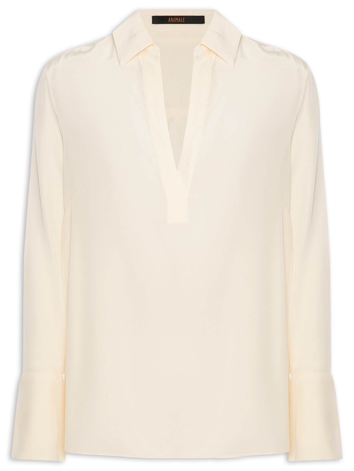 A camisa bege é confeccionada em seda. A peça possui decote V profundo com colarinho aplicado, mangas longas com abotoamento e prega nos punhos, recorte posterior com prega, pences frontais, fendas laterais, comprimento alongado e shape solto.