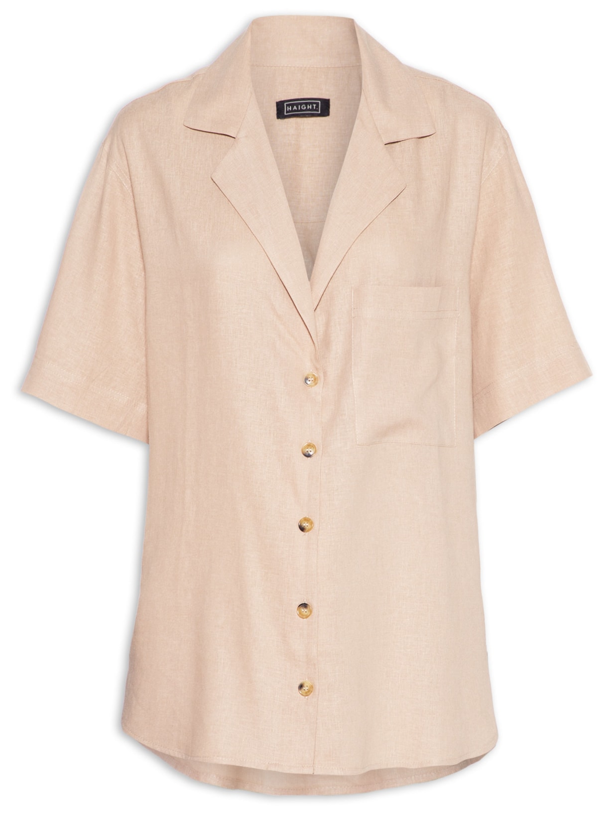 A camisa bege é confeccionada em tecido leve com toque de linho sem elasticidade. A peça solta ao corpo possui colarinho chanfrado, ombros estendidos, mangas curtas, bolso frontal aplicado na altura do tórax, recorte posterior com detalhe de prega, barra arredondada, comprimento alongado e fechamento frontal por botões.