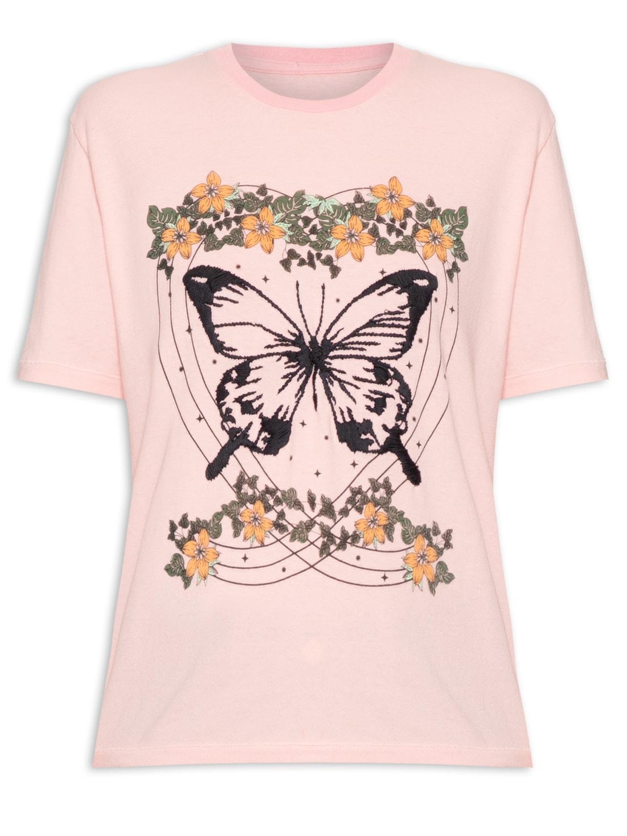 A camiseta rosa é confeccionada em malha leve de média elasticidade. A peça solta ao corpo possui decote redondo com acabamento canelado, mangas curtas, mix de estampas em silk de cores contrastantes na parte frontal e bordado frontal figurativo de borboleta na cor preta.