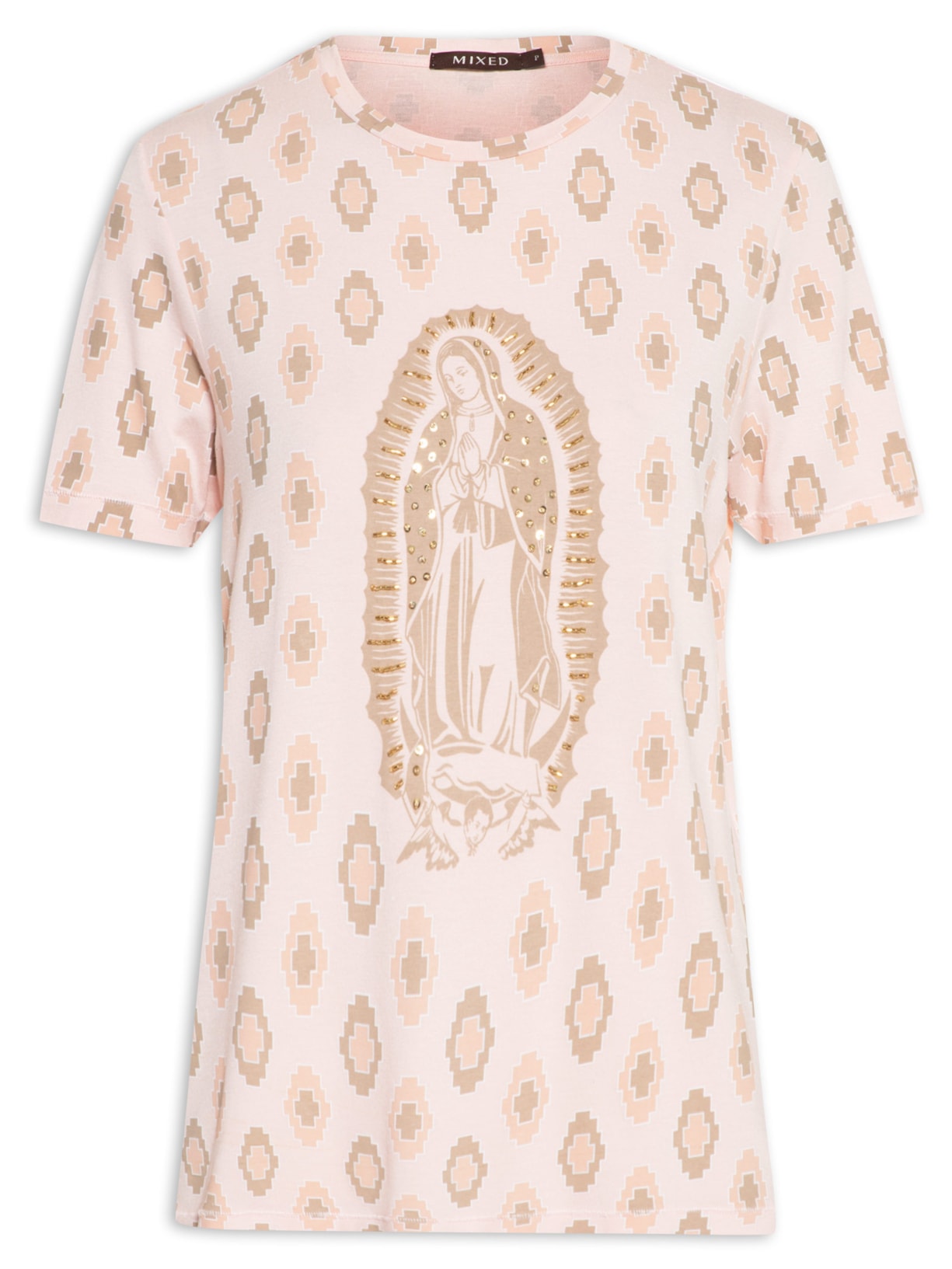 A camiseta rosa é confeccionada em malha. A peça possui decote redondo com acabamento canelado, mangas curtas, padronagem geométrica em cores contrastantes, estampa frontal de nossa senhora de guadalupe com detalhes em miçangas e paetês em cores contrastantes.
