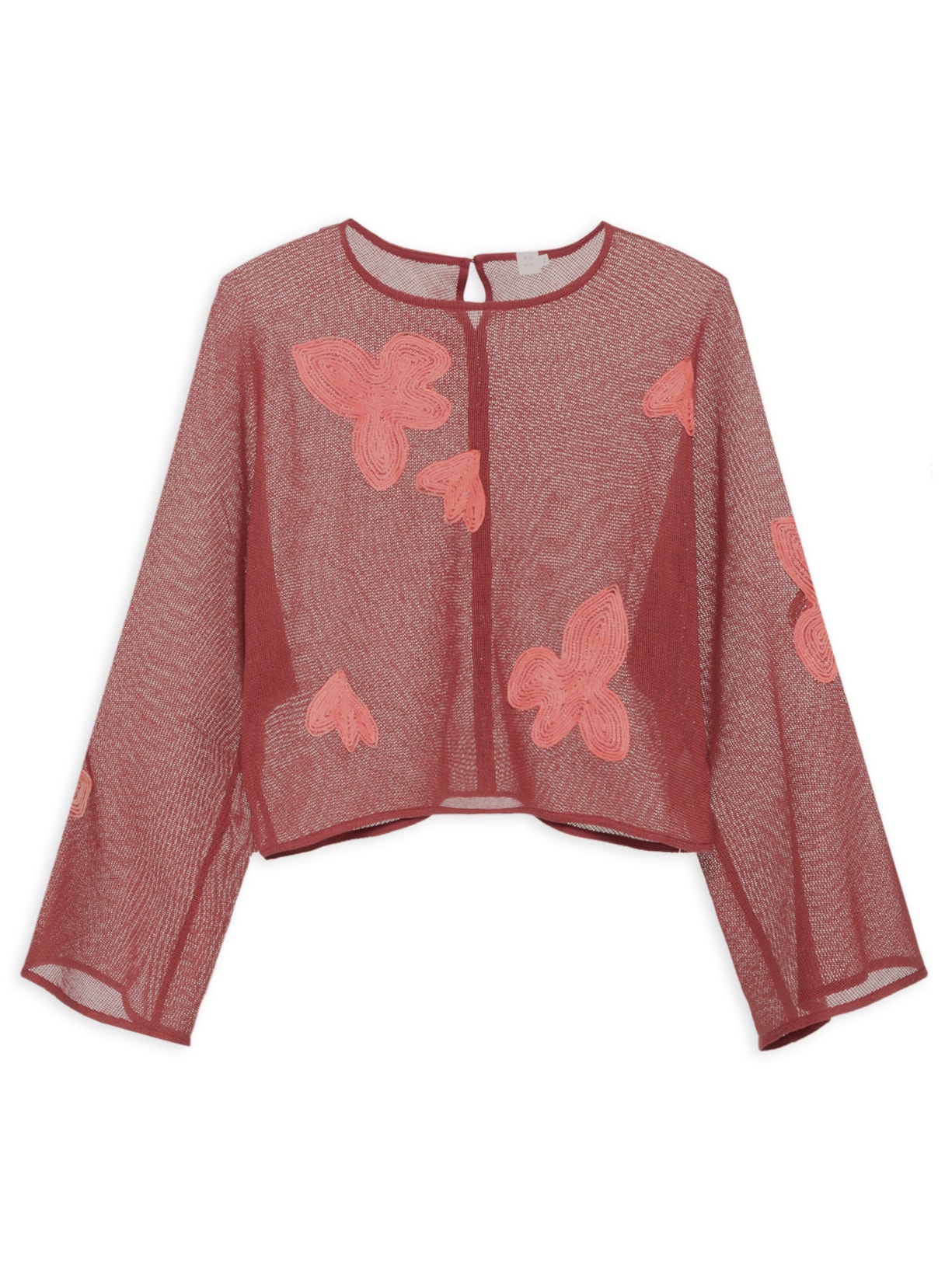 A camiseta vermelha é confeccionada em tela sem elasticidade. A peça solta ao corpo possui decote arredondado, mangas longas amplas modelo japonesa, abertura posterior com fechamento por botão, transparência e aplicações abstratas em cor contrastante aplicadas na parte frontal.