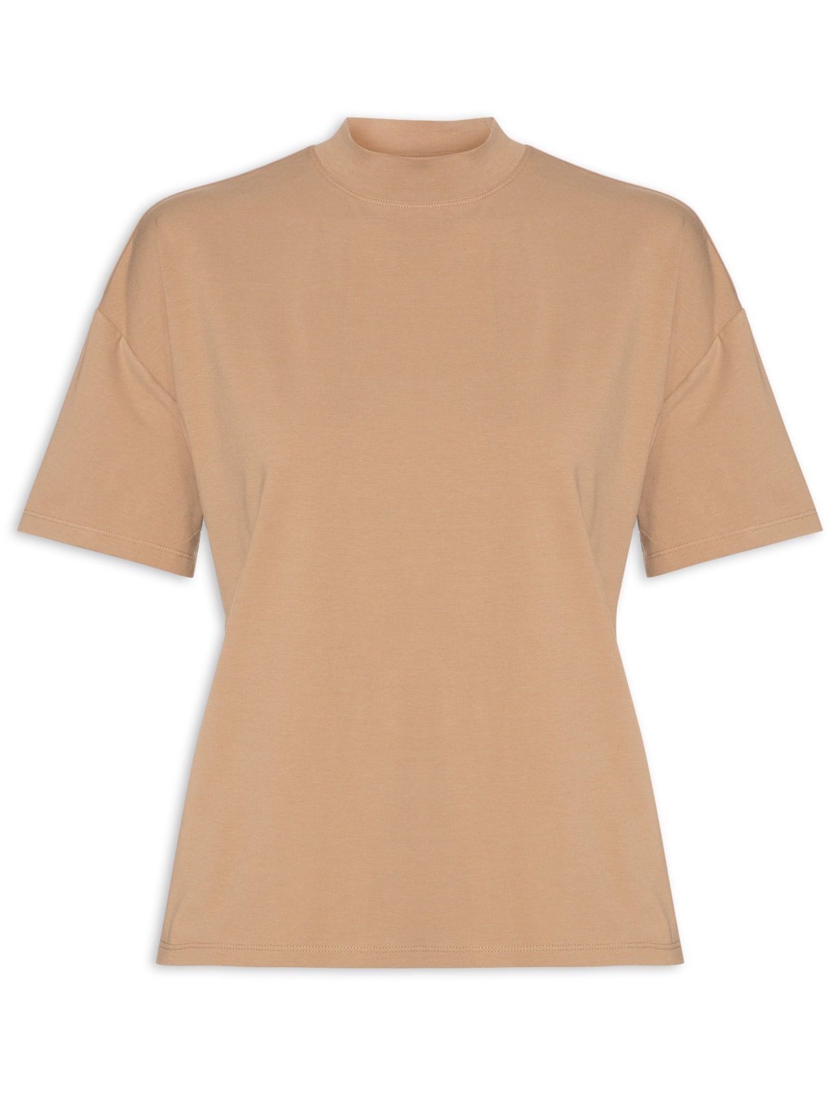 A camiseta bege é confeccionada em malha de algodão com média elasticidade. A peça solta ao corpo possui gola alta, ombros estendidos, mangas curtas, prega posterior com detalhe de tira sobreposta na altura da cintura e acabamento canelado.