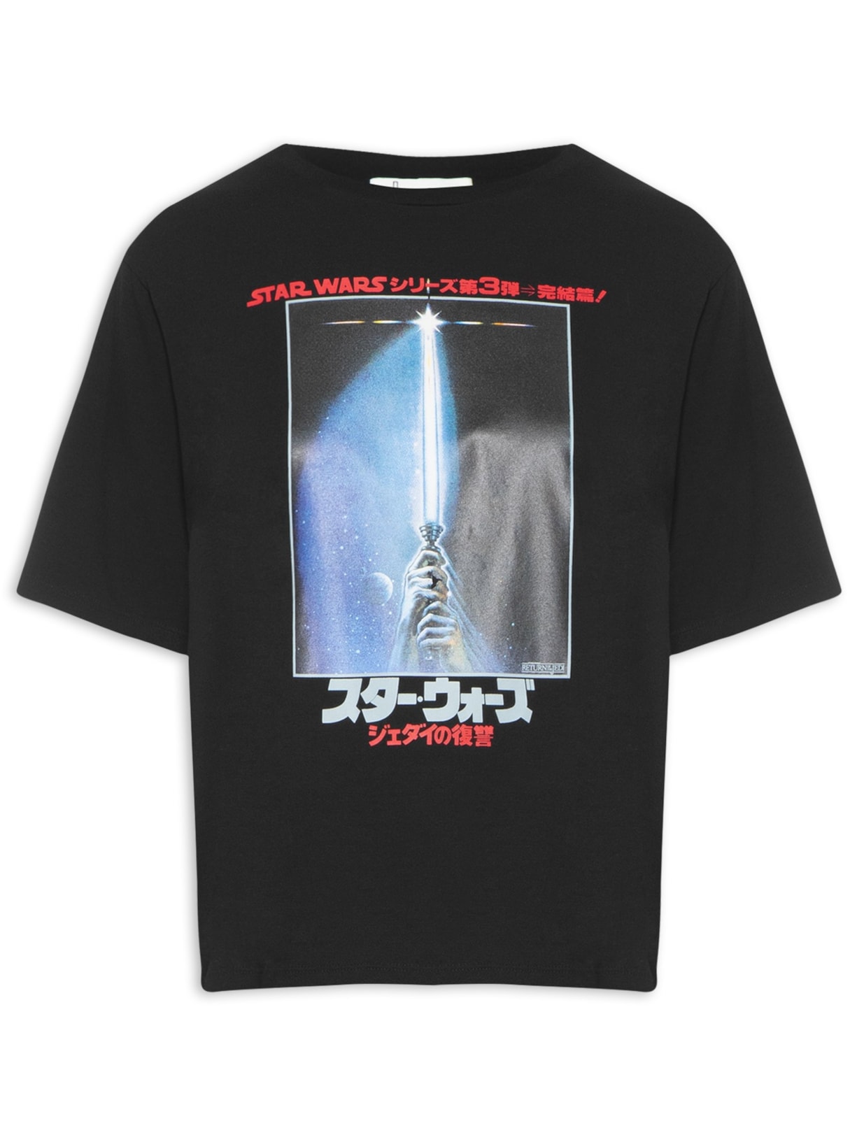 A t-shirt preta é confeccionada em malha de algodão com média elasticidade. A peça solta ao corpo possui decote redondo com acabamento canelado, mangas curtas e estampa posterior e frontal em silk com cores contrastantes.