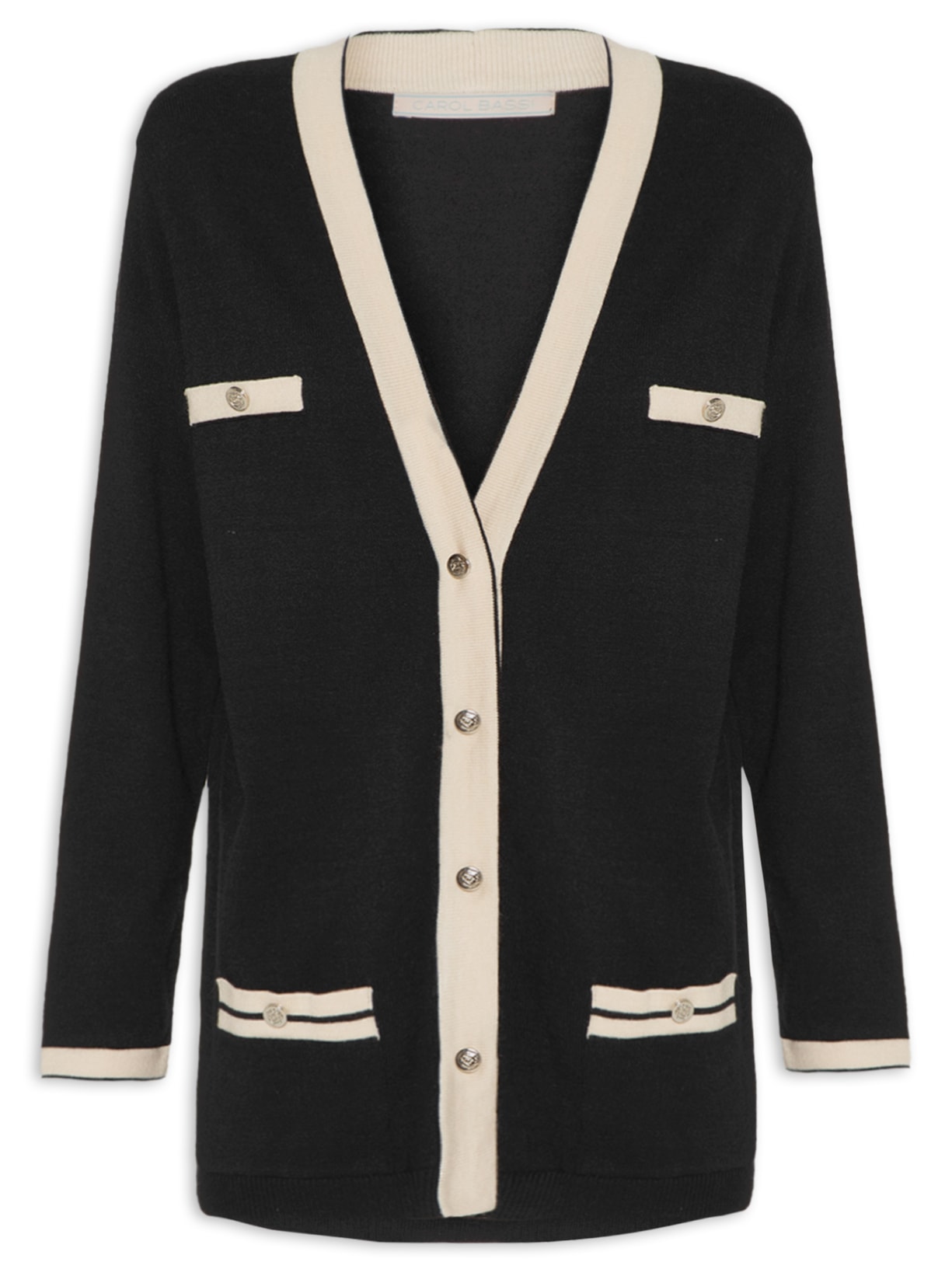 O cardigan preto é confeccionado em tricot. A peça possui mangas longas, vistas sobrepostas em cor contrastante na altura do busto com botão aplicado, bolsos frontais decorativos com botões aplicados, detalhe de linhas em cor contrastante na parte frontal, comprimento alongado, shape solto e fechamento frontal por botões de pressão.