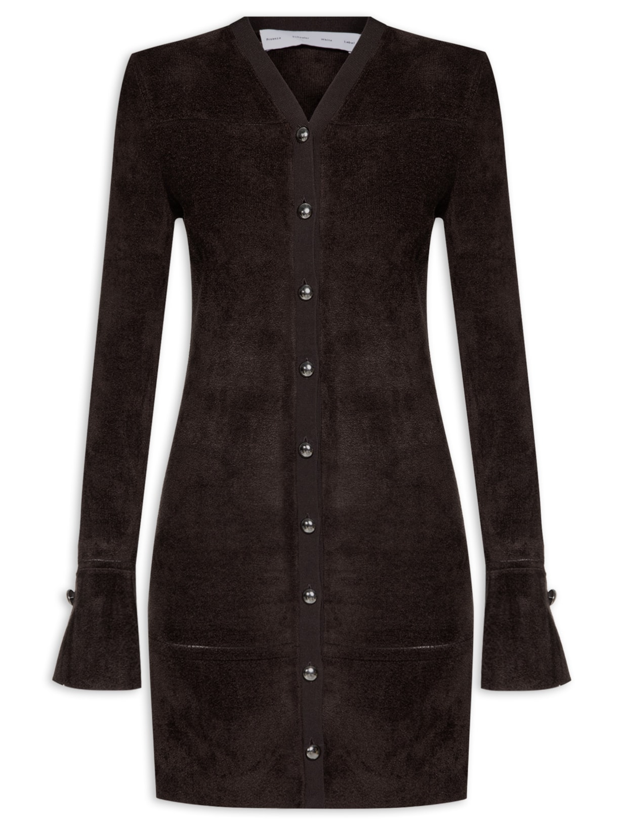O cardigan marrom é confeccionado em chenille* de média elasticidade. A peça solta ao corpo possui decote V, mangas longas com detalhe de botão metálico decorativo nos punhos, recortes frontais com aplicação de entremeio com recortes vazados, acabamento canelado, comprimento alongado e fechamento frontal em botões.