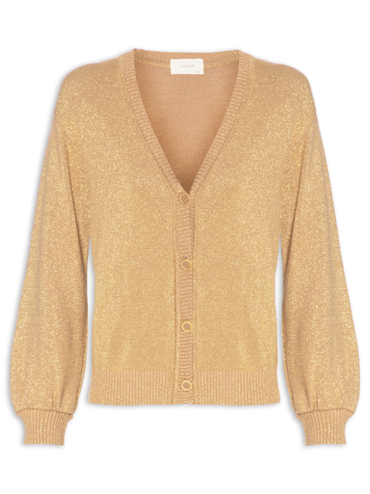 O cardigan dourado é confeccionado em tricot com alta elasticidade. A peça solta ao corpo possui decote V profundo, mangas longas com ajuste nos punhos, fios de lurex na cor dourado, ombros estendidos e fechamento frontal por botões.