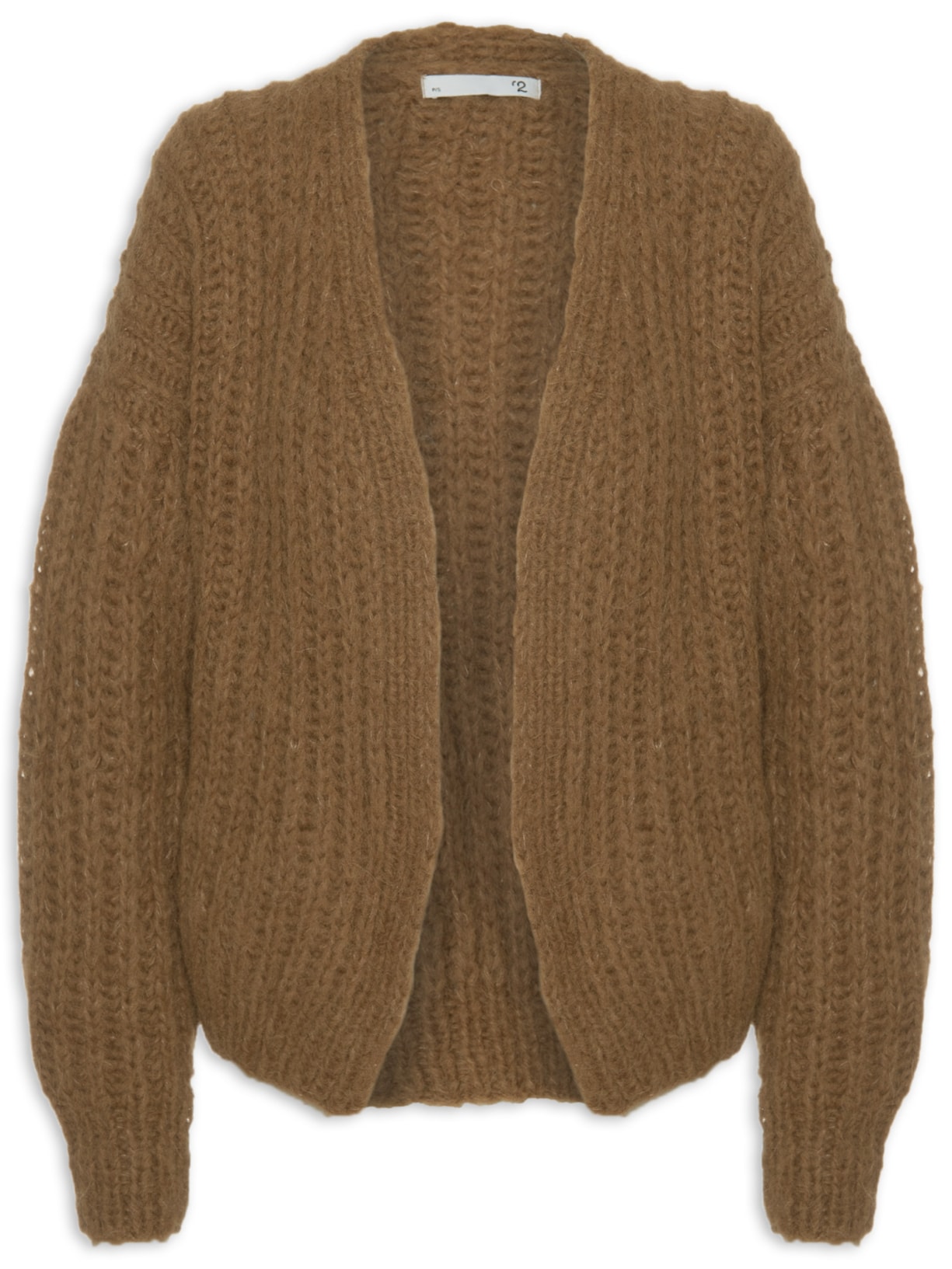 O cardigan marrom é confeccionado em alpaca. A peça possui ombros estendidos, mangas longas, shape solto, caimento reto e acabamento canelado.