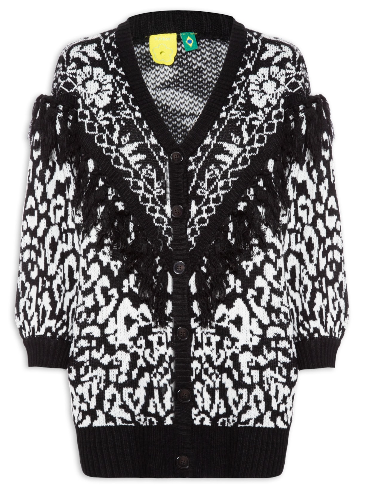 O cardigan preto é confeccionado em tricot de baixa elasticidade. A peça solta ao corpo, possui ombros estendidos, mangas longas com punho afunilado, recorte frontal e posterior com franjas aplicadas e padronagem floram preta e branca, padronagem animal em preto e branco, comprimento longo, acabamento canelado preto e fechamento frontal por botões.