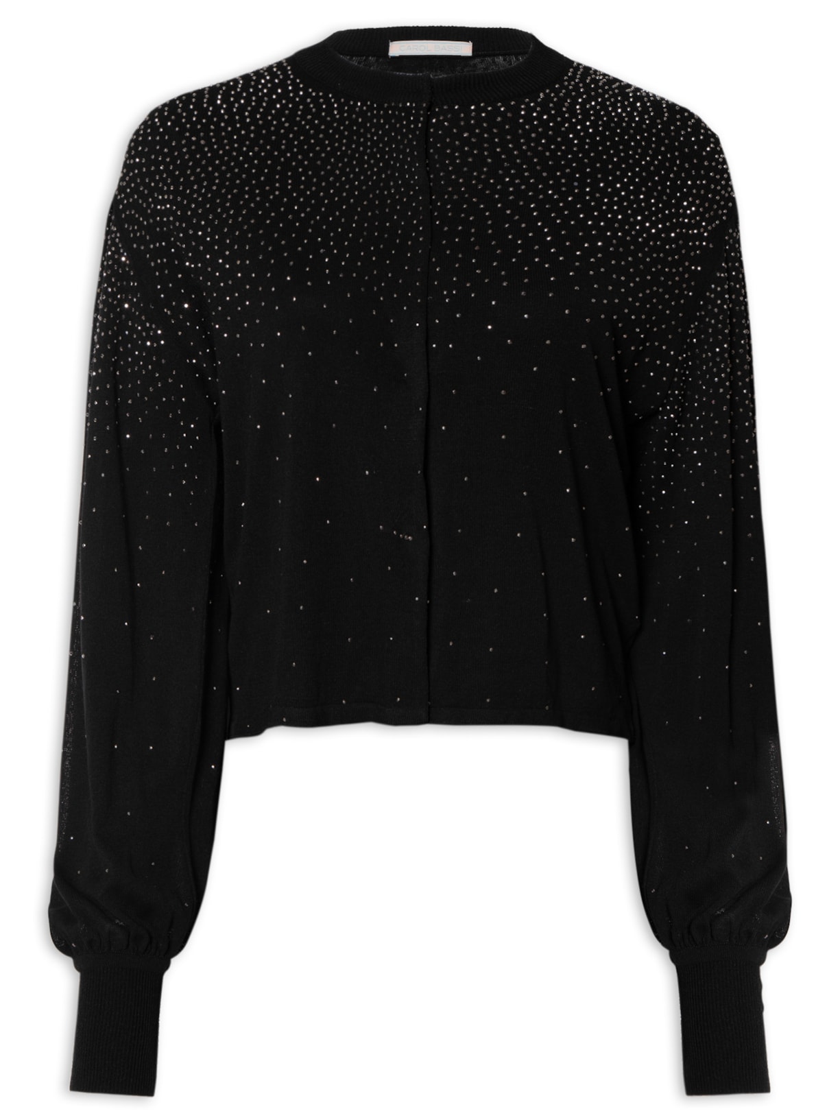 O cardigan preto é confeccionada em tricot leve. A peça possui decote redondo, ombros estendidos, mangas longas e bufantes com ajuste nos punhos e pregas nas cavas, aplicações de strass com efeito degradê na parte frontal e posterior, shape solto, caimento reto, acabamento canelado e fechamento frontal por botões de pressão.