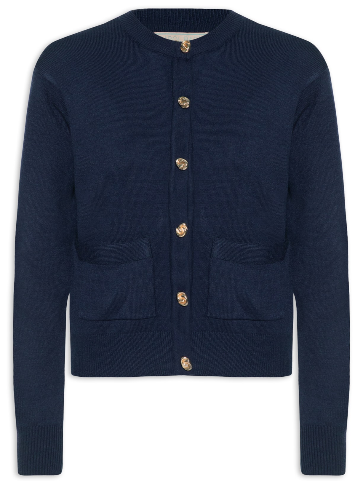 O cardigan azul marinho é confeccionado em tricot com alta elasticidade. A peça solta ao corpo possui decote redondo, mangas longas com ajuste nos punhos, ombros estendidos, bolsos frontais e fechamento frontal por botões.