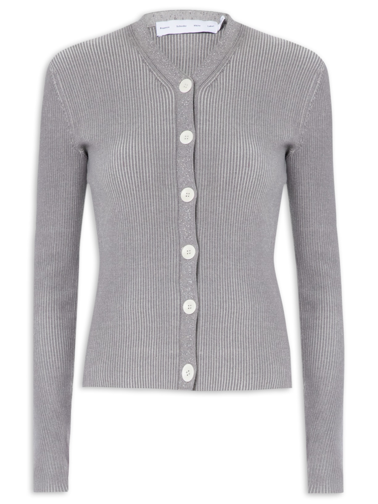 O cardigan cinza é confeccionado em tricot de alta elasticidade. A peça justa ao corpo possui decote V, mangas longas com recorte posterior em tom contrastante, trama com efeito mescla e fios em tons contrastantes, barra com corte a fio e fechamento frontal em botões.