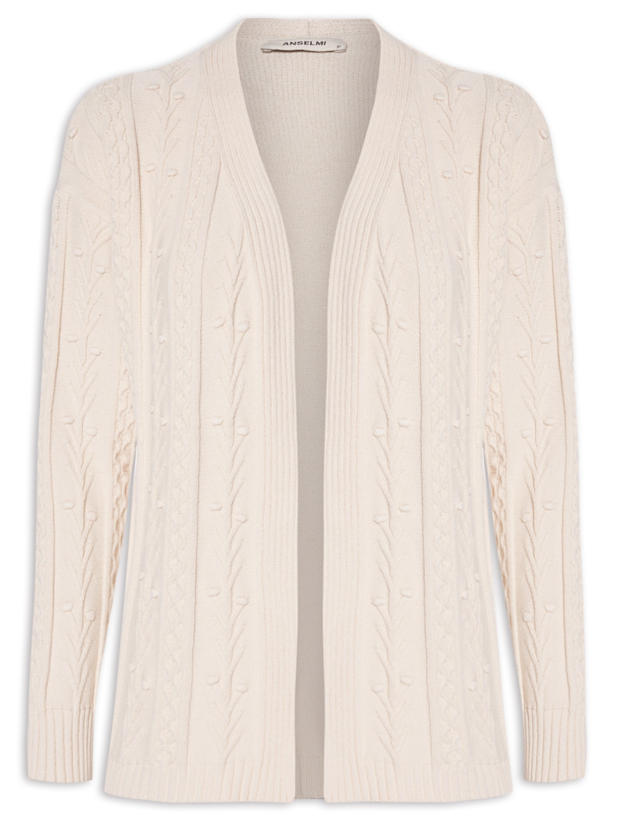 O casaco off white é confeccionado em tricot com superfície texturizada de média elasticidade. A peça solta ao corpo, possui, ombros estendidos, mangas longas, mix de padronagens decorativas na parte frontal e mangas, acabamento canelado, comprimento alongado, e sem fechamento.