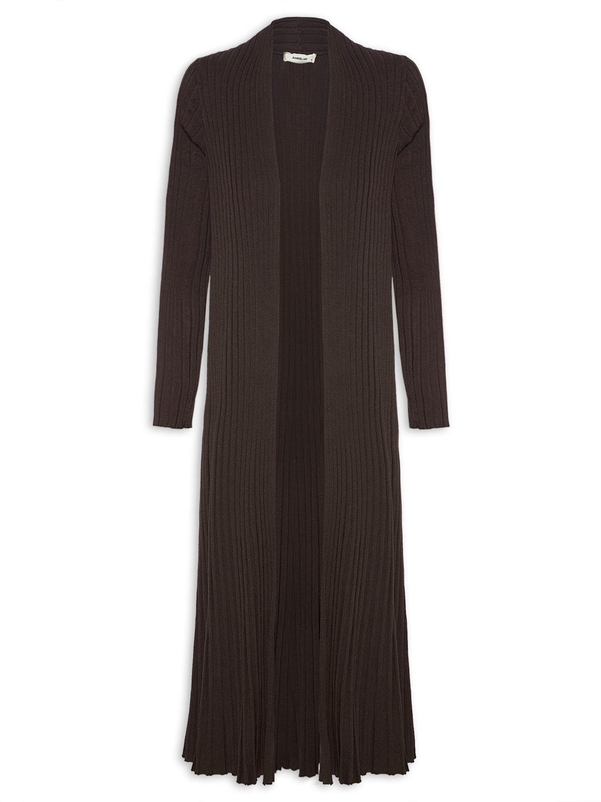 O casaco marrom é confeccionado em tricot canelado com alta elasticidade. A peça possui mangas longas, ombros estendidos e comprimento alongado.
