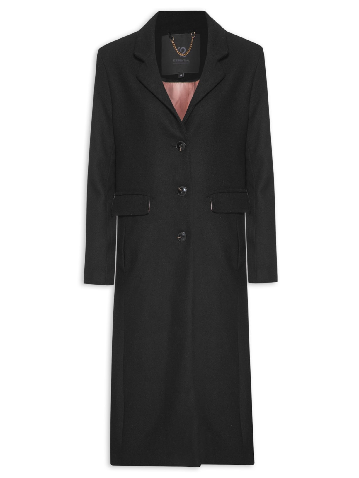 O casaco preto é confeccionado em tecido encorpado sem elasticidade. A peça solta ao corpo possui lapela chanfrada, mangas longas com fenda, recortes posteriores, fenda posterior, forro, comprimento alongado e fechamento frontal em botões marmorizados, bolsos frontais embutidos com fechamento em abas sobrepostas.
