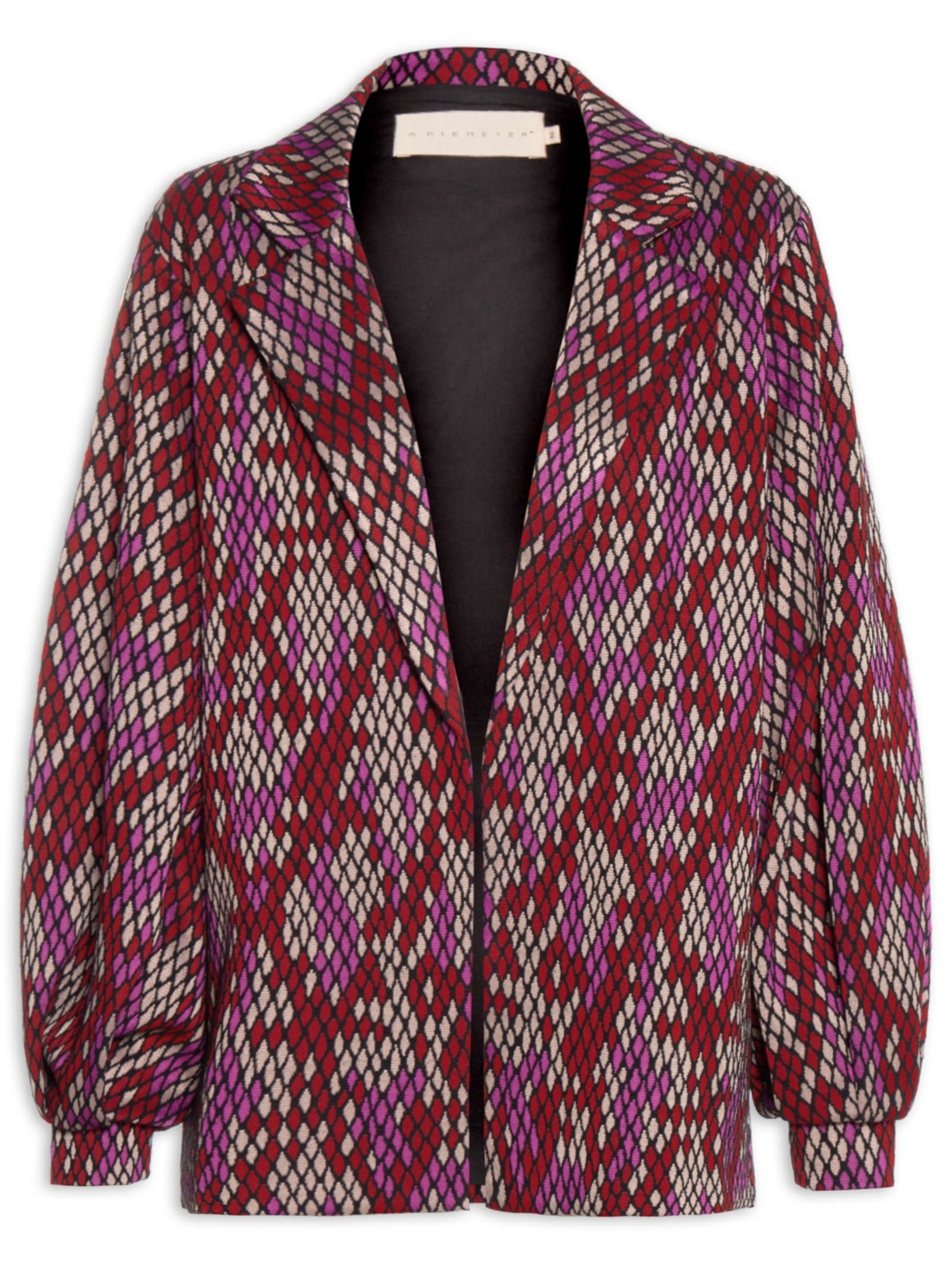 As estampas geométricas são clássicas e atemporais, como este casaco de A. Niemeyer combinada com uma calça de mesma cor, blusa preta e sandálias modelo puffer para arrasar na composição.