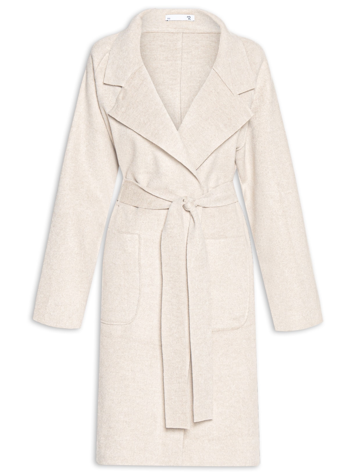 O casaco bege é confeccionado em tecido leve sem elasticidade. A peça solta ao corpo possui lapela chanfrada, mangas longas, bolsos frontais embutidos, recortes frontais e posteriores, faixa de cinto de mesma cor para uso opcional para amarração.