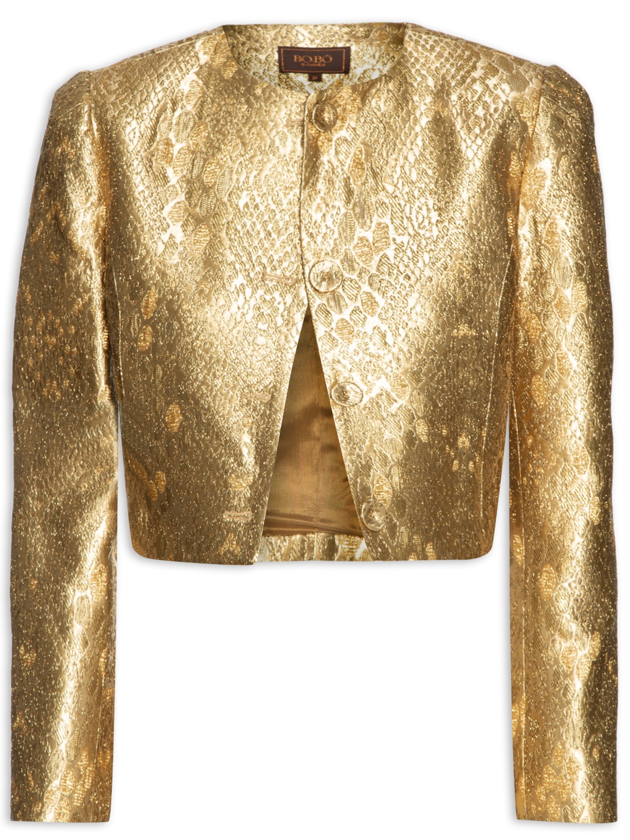 O casaco dourado é confeccionado em jacquard com superfície texturizada, fios de lurex metalizados e sem elasticidade. A peça solta ao corpo possui decote redondo, ombros levemente acolchoados, mangas longas, pences frontais, recortes posteriores, trama com textura em relevo com fios em tons contrastantes, forro, comprimento cropped* e fechamento frontal em botões.