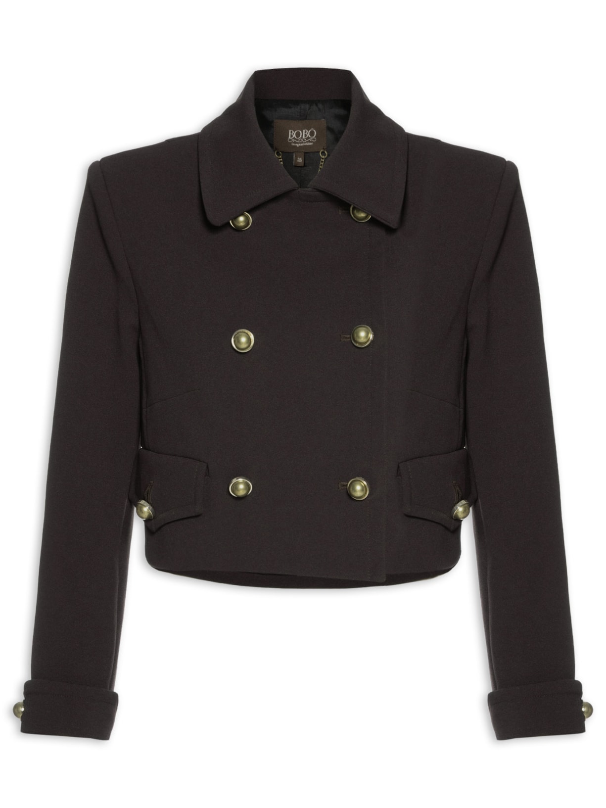 O casaco marrom é confeccionado em tecido encorpado com baixa elastidade. A peça solta ao corpo possui lapela chanfrada, mangas longas com abotoamento nos punhos, bolsos frontais decorativos, botões metalizados decorativos na parte frontal, pences frontais, recortes posteriores, corrente metalizada com pingente do logo da marca aplicada na parte interior, forro, comprimento cropped* e fechamento frontal por botões.