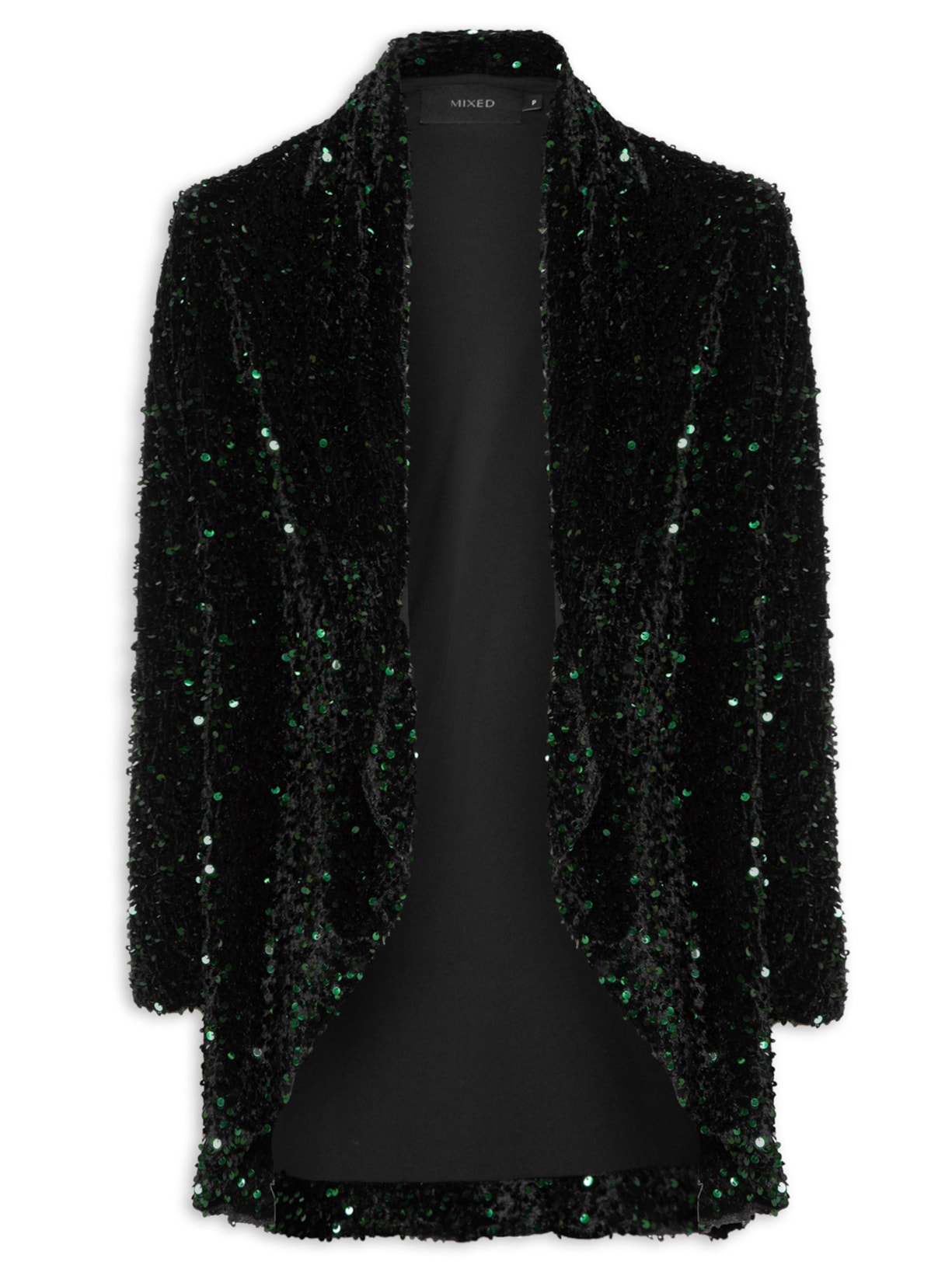Peças e acessórios em paetês chegam com tudo nesta temporada! A tendência da semana de moda chega com diversas superfície e tamanhos. Aposte nesse casaco Mixed ao lado de um macacão preto, sapato de bico fino e brincos alongados!