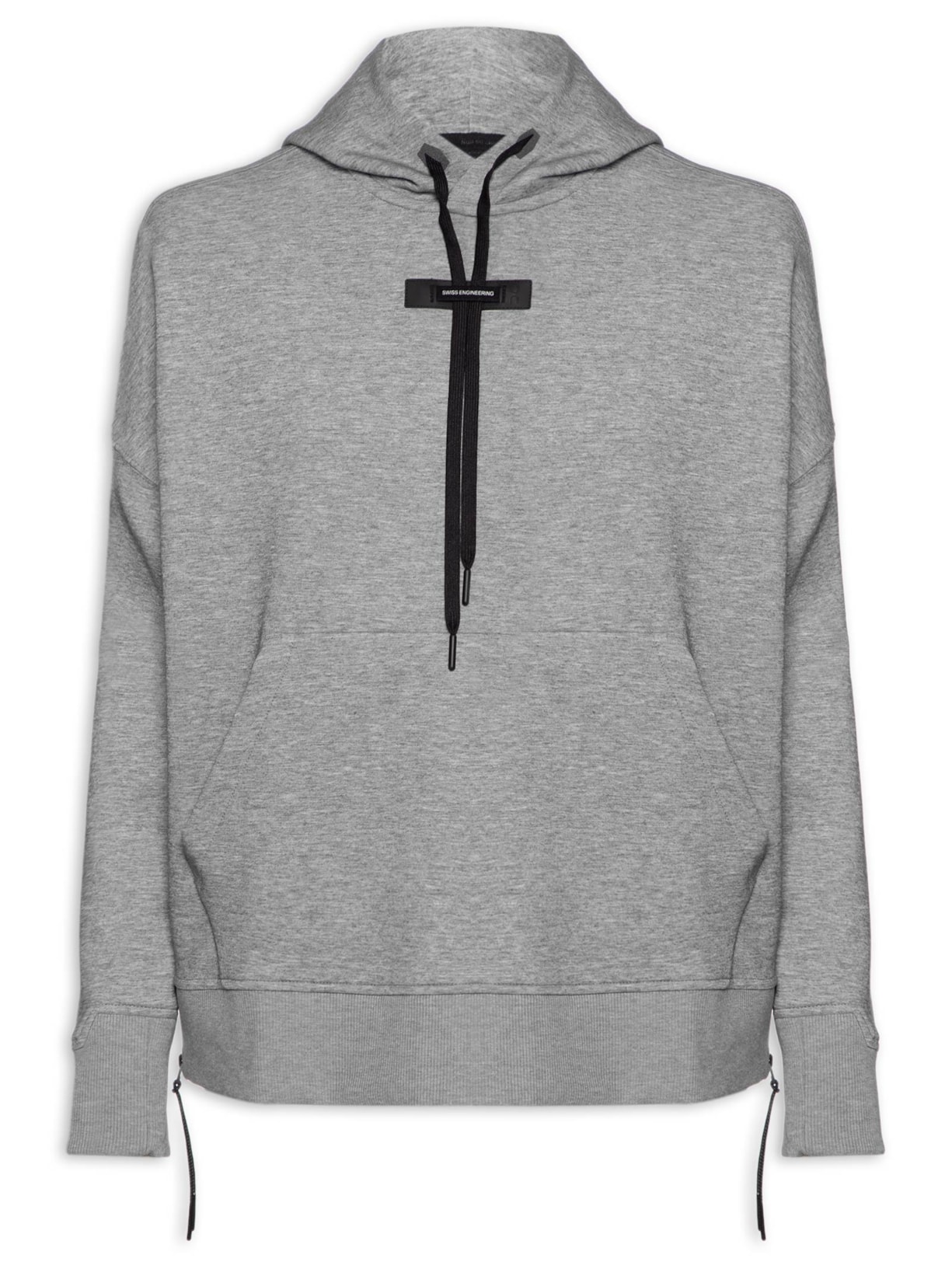 O casaco cinza é confeccionado em moletom com média elasticidade. A peça solta ao corpo possui capuz com cordão embutido, mangas longas, ombros estendidos, bolso canguru na parte frontal, tag da marca aplicada na parte frontal em material emborrachado, aberturas laterais com fechamento por zíper, logo da marca aplicado na parte posterior na altura da barra e acabamento canelado nos punhos e barra.
