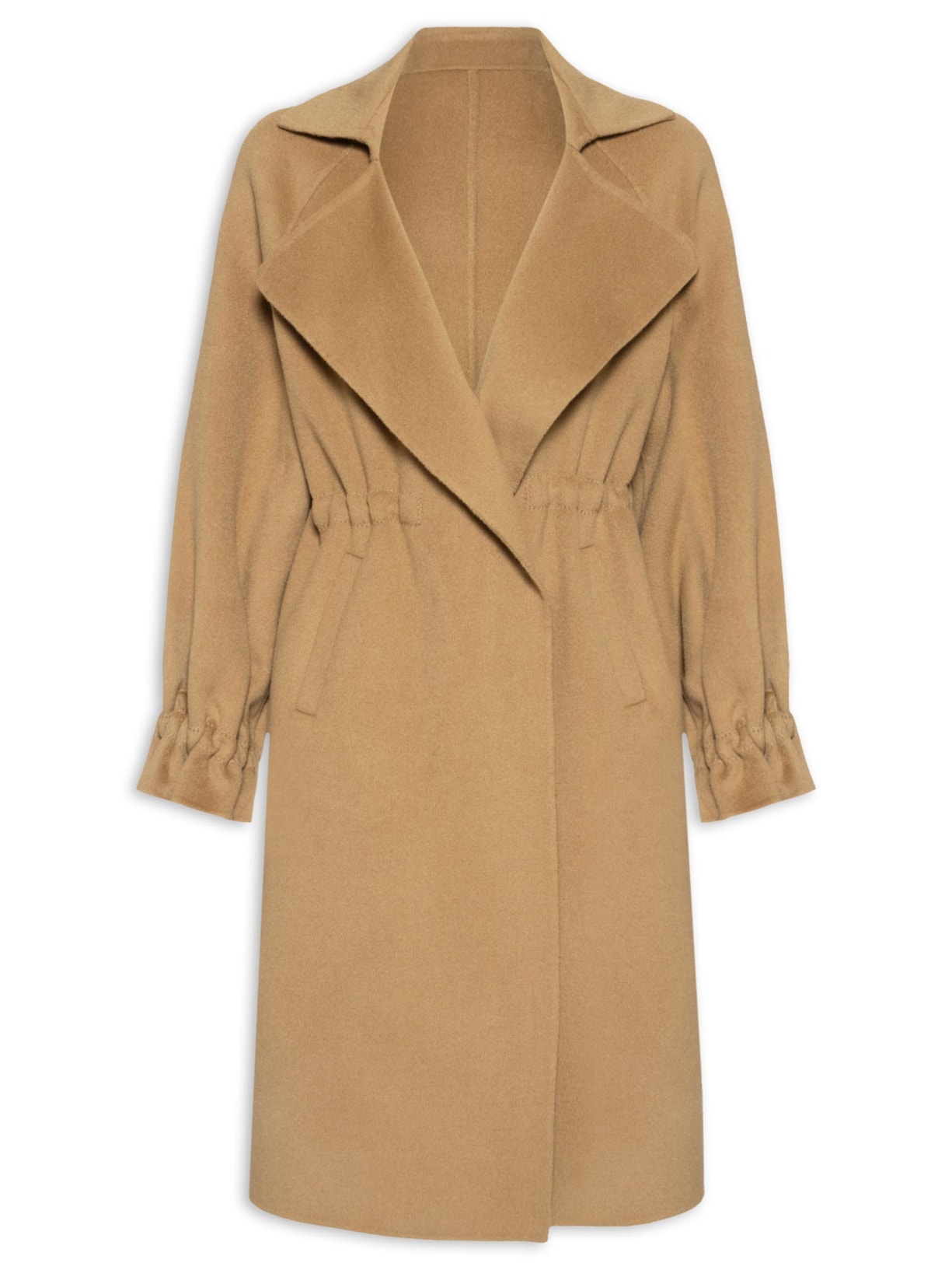 O casaco marrom é confeccionado em lã sem elasticidade. A peça solta ao corpo, possui maxi lapela chanfrada, manga longa de modelo raglan com punho poeta e elástico embutido, cordão embutido na cintura com ajuste interno por enforcadores metálicos, bolsos frontais embutidos, comprimento alongado e fechamento frontal por amarração interna.