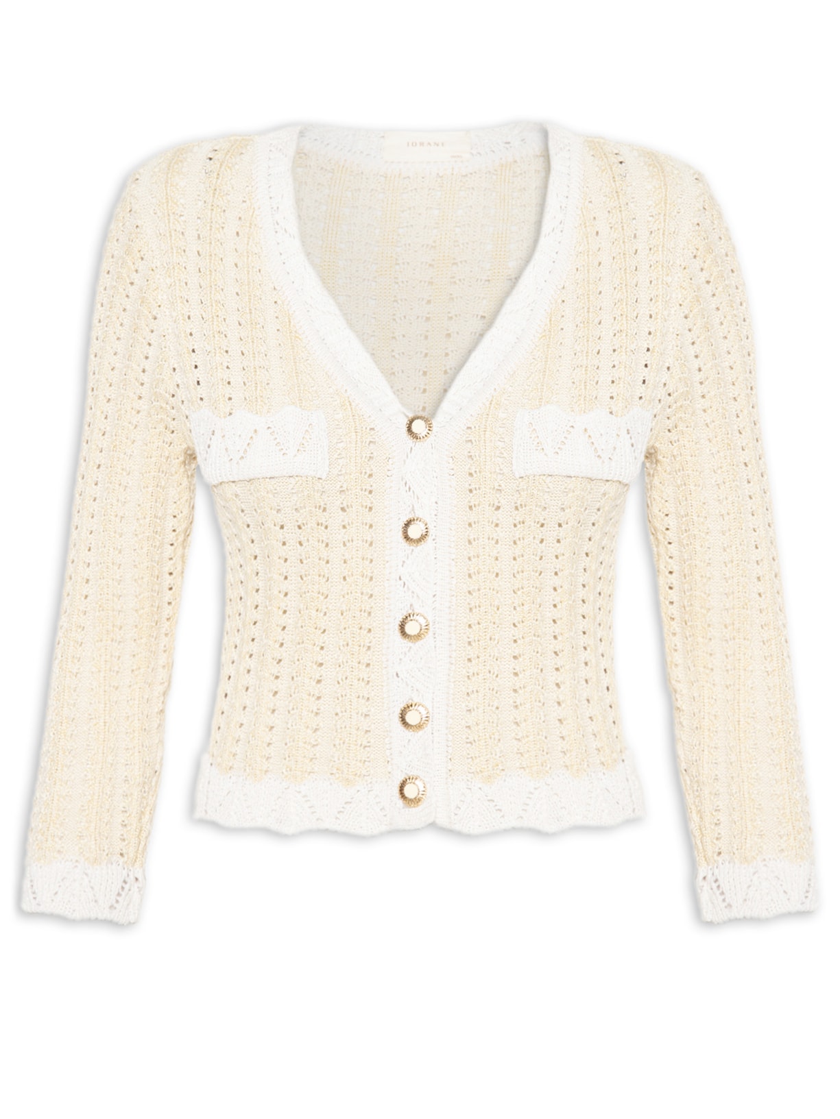 O casaco bege é confeccionado em crochê. A peça possui mangas 3/4, vistas decorativas aplicadas na altura do busto, detalhe de bordas e vistas em cor contrastante, comprimento cropped*, shape solto, caimento reto, acabamento canelado e fechamento frontal por botões estilizados