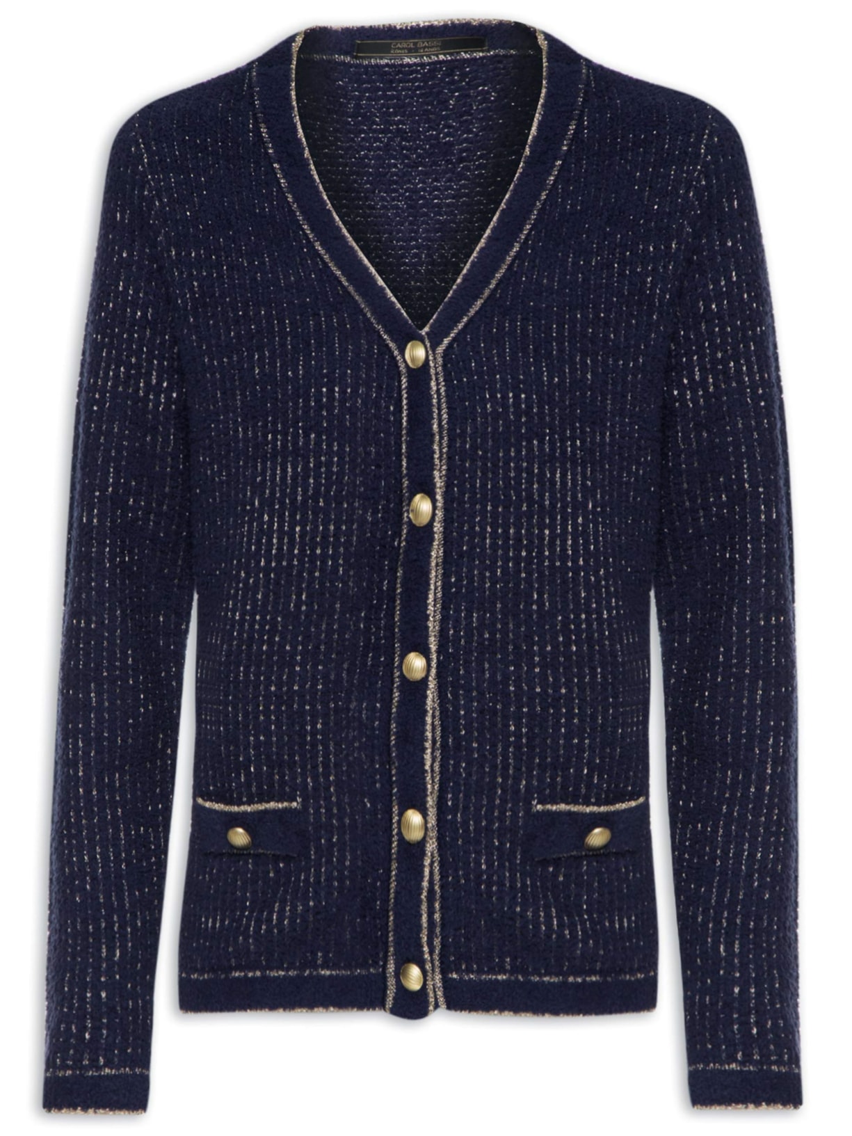 O casaco azul é confeccionado em tricot com fios de lurex, superfície texturizada e média elasticidade. A peça possui mangas longas, bolsos frontais decorativos com botões aplicados e fechamento frontal por botões metalizados.