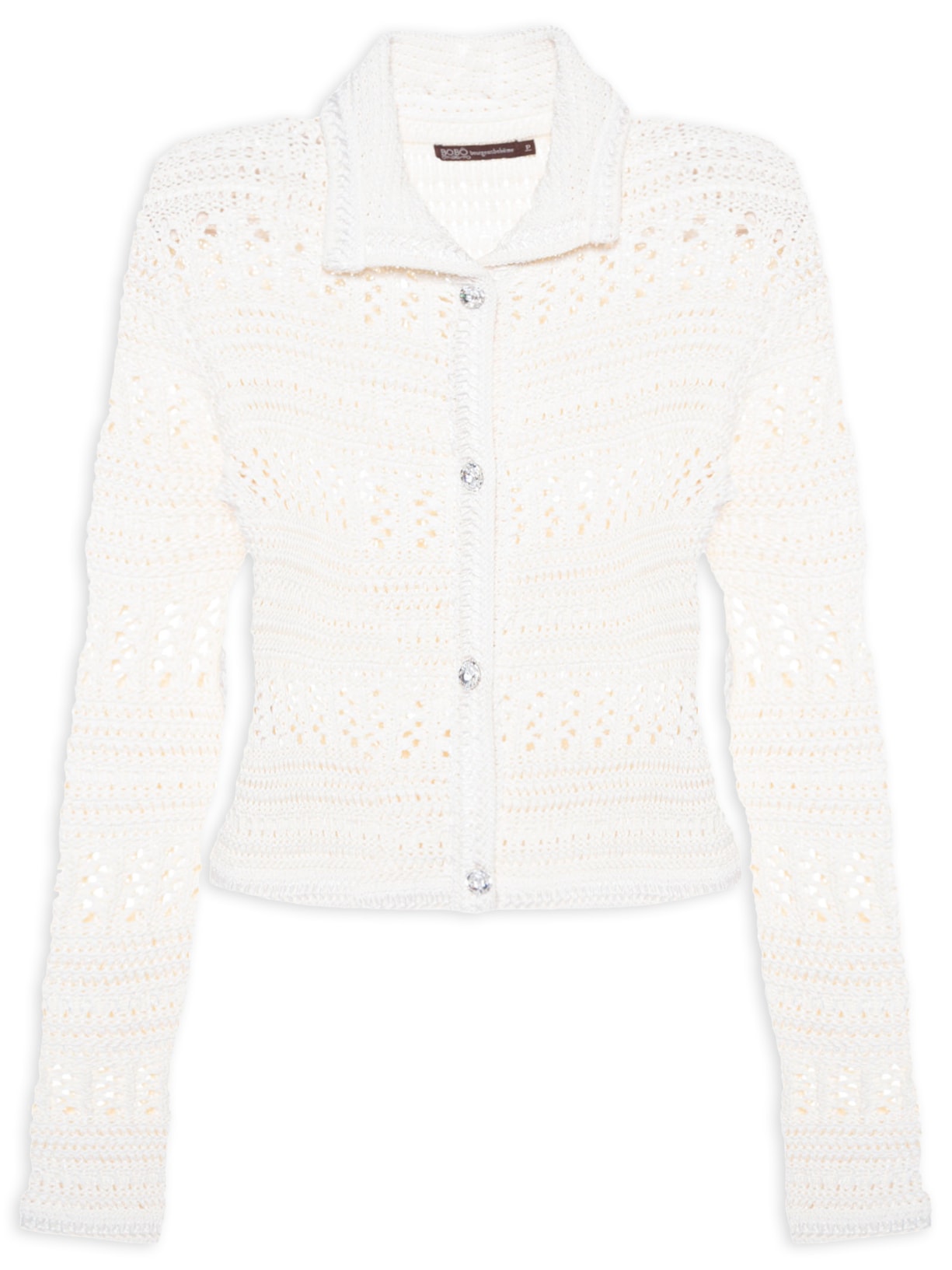 O casaco off white é confeccionado em crochê. A peça possui colarinho simples, mangas longas, leve transparência, shape solto, caimento reto, acabamento canelado e fechamento frontal por botões.