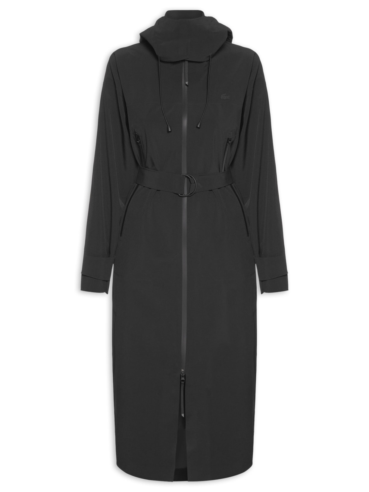 O casaco preto é confeccionado em tactel com baixa elasticidade. A peça solta ao corpo possui gola alta, mangas longas com ajuste nos punhos, bolsos frontais embutidos com fechamento por zíper, capuz, passantes aplicados na parte posterior, recortes frontais e posteriores, fenda frontal, forro em material sintético com logo da marca aplicado, comprimento alongado e fechamento frontal por zíper. Acompanha cinto de espessura média da mesma cor e tecido para uso opcional.