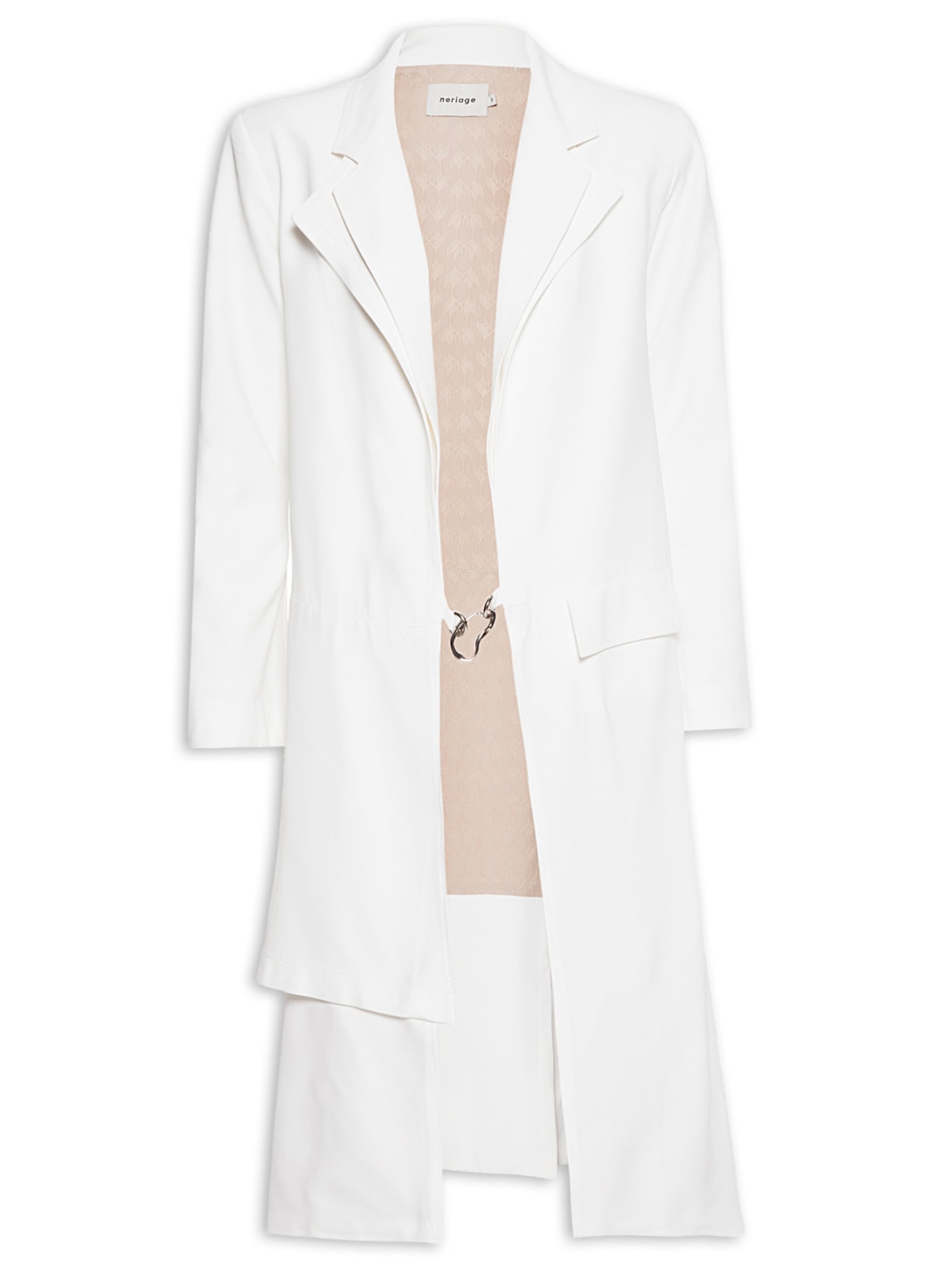 O casaco off white é confeccionado em tecido encorpado. A peça possui lapela chanfrada, mangas longas, bolso frontal com fechamento por aba sobreposta, fenda posterior, forro, shape solto, caimento reto, acabamento pespontado e fechamento frontal por fivela metalizada.