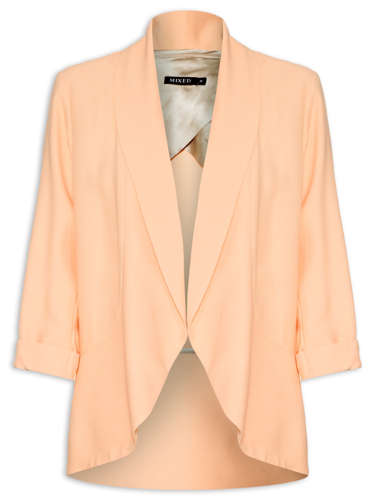 O casaco laranja é confeccionado em tecido leve sem elasticidade. A peça solta ao corpo possui lapela chanfrada, mangas longas com barra italiana, franzido nos ombros, recortes frontais e posteriores e comprimento alongado.