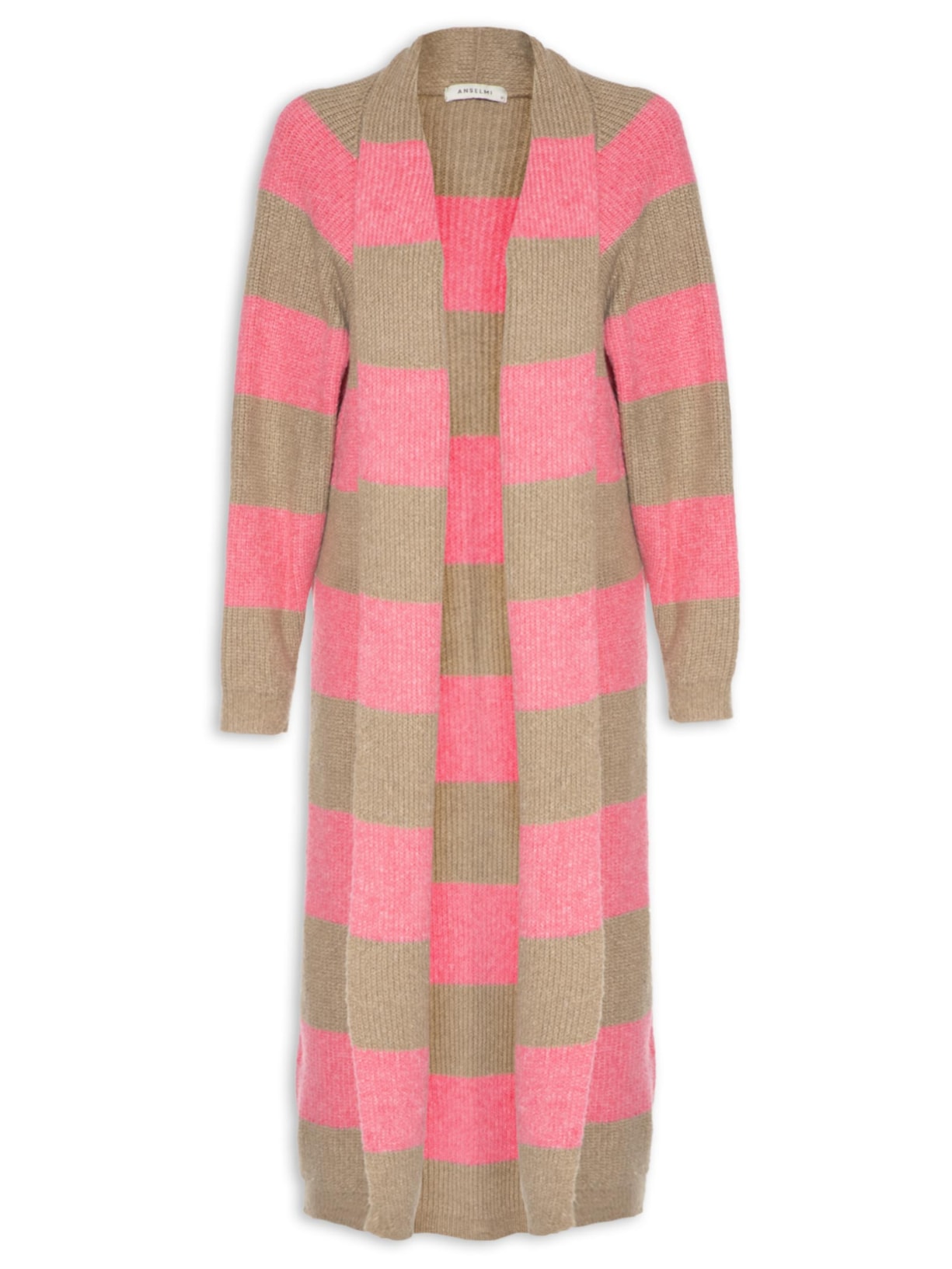 O casaco marrom é confeccionado em tricot com alta elasticidade. A peça solta ao corpo possui ombros e cavas estendidos, mangas longas, acabamento canelado da gola a barra, estampas listras e comprimento logo.