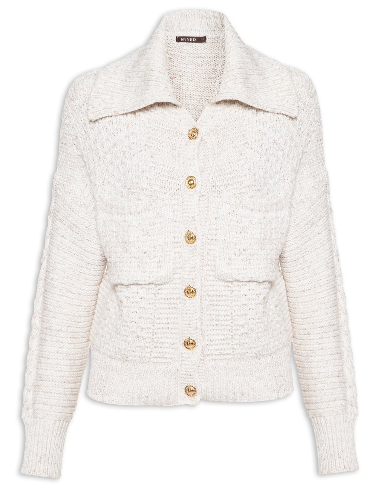 O casaco off white é confeccionado em tricot com superfície texturizada de alta elasticidade. A peça solta ao corpo, possui maxi colarinho, mangas longas com ajuste nos punhos, detalhe trançado nas mangas, bolsos frontais e fechamento frontal por botões.